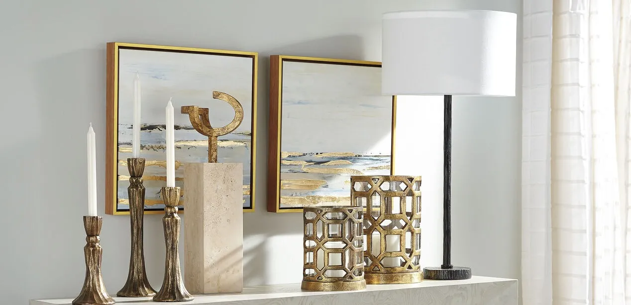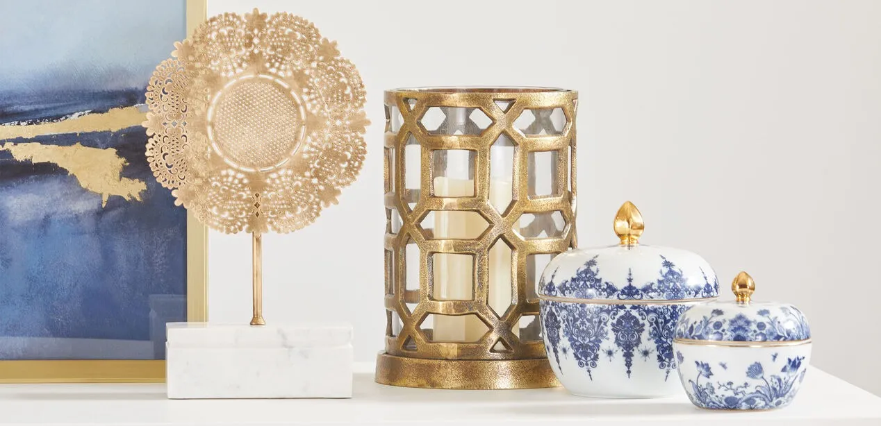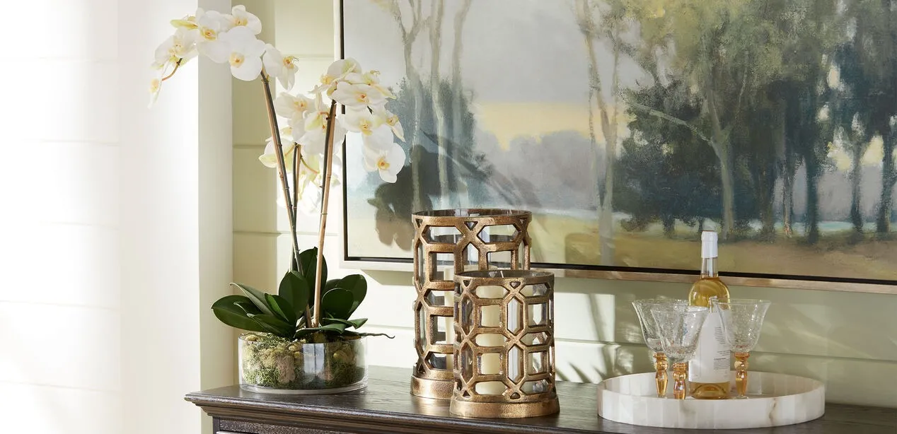 A hurricane candle holder with a beautiful geometric overlay in a soft brass finish