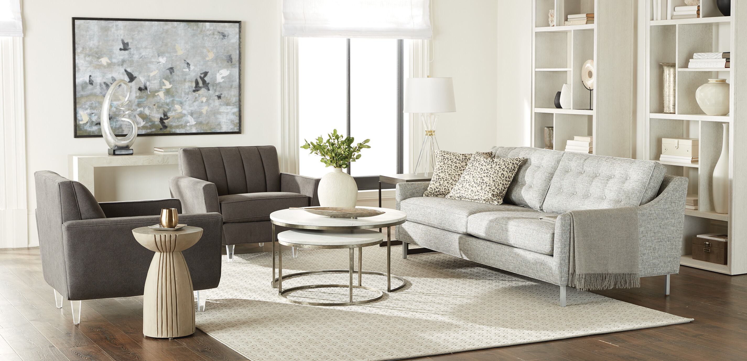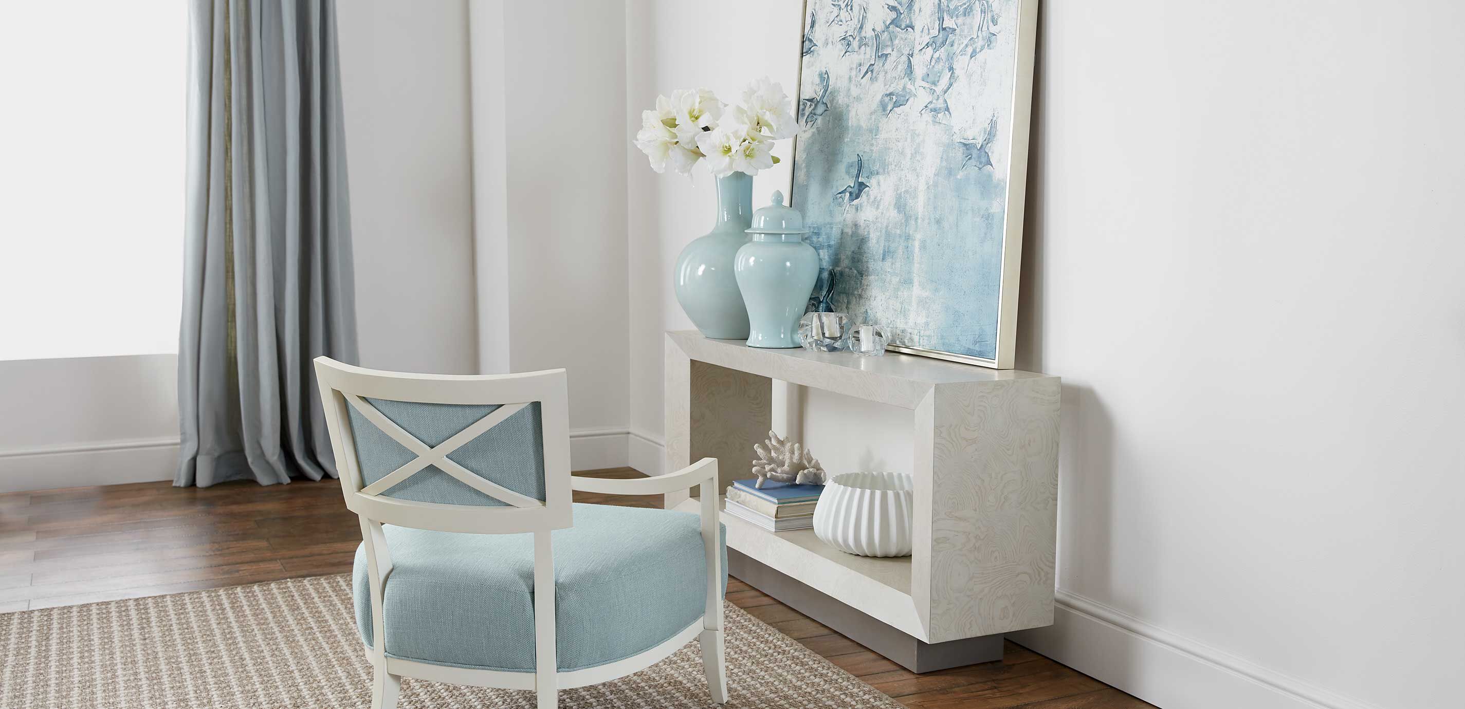 This is what design looks like when it's pared down to the essentials. The Braemore round end table's minimalist form is the perfect showcase for a striking wood grain pattern; its supports, crafted from steel with a satin nickel finish, add just the right amount of luster. Place this round side table by your favorite chair, or buy a pair and place one on each end of your sofa. Small and versatile, Braemore has a transitional look that brings a soothing simplicity to any space. The Braemore round end table, with its minimalist design and versatile size, has a transitional, serene vibe that brings balance to any space. Side supports are crafted from steel and finished in a warm satin nickel for subtle yet distinctive luster Multilayer wood finish is wire-brushed by hand to bring out the wood grain Available in multiple finishes: End tables with the unique Alabaster (733) finish are crafted from olive ash burl, with olive ash burl veneers* arranged in an elegant parquet pattern End tables with the more casual Gray Flannel (483) or Mink (487) finishes are crafted from quarter-sawn oak,* with hand-applied oak veneers for a consistent and visible surface grain For a unified style statement, pair this round side table with additional pieces from the Braemore collection: the Braemore Rectangular Plinth-Base Console Table, Braemore Round Plinth-Base Coffee Table, and Braemore Rectangular Plinth-Base Coffee Table Easy-to-use levelers ensure stability, even on uneven floors