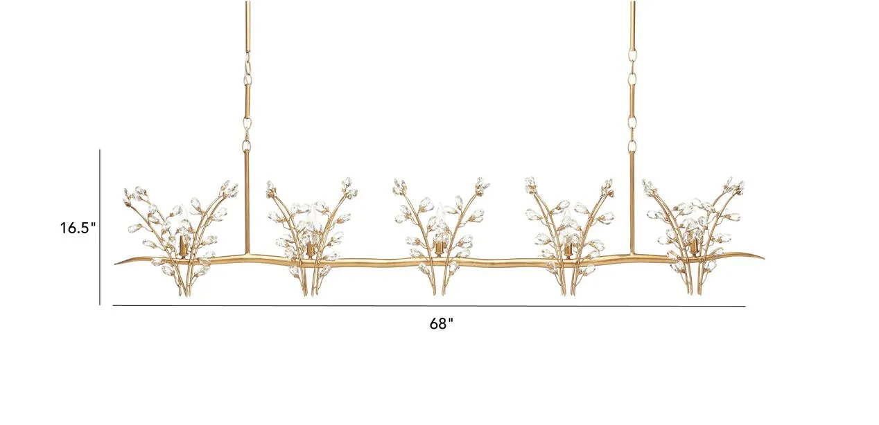 Prepare to be enchanted. Our ethereal Clara Bud Linear Chandelier is rustic in form--almost as if crafted of flowering branches and vines--but finished in a classic antiqued brass paint to complement its crystal "bud" accents. A stunning example of creative craftsmanship.