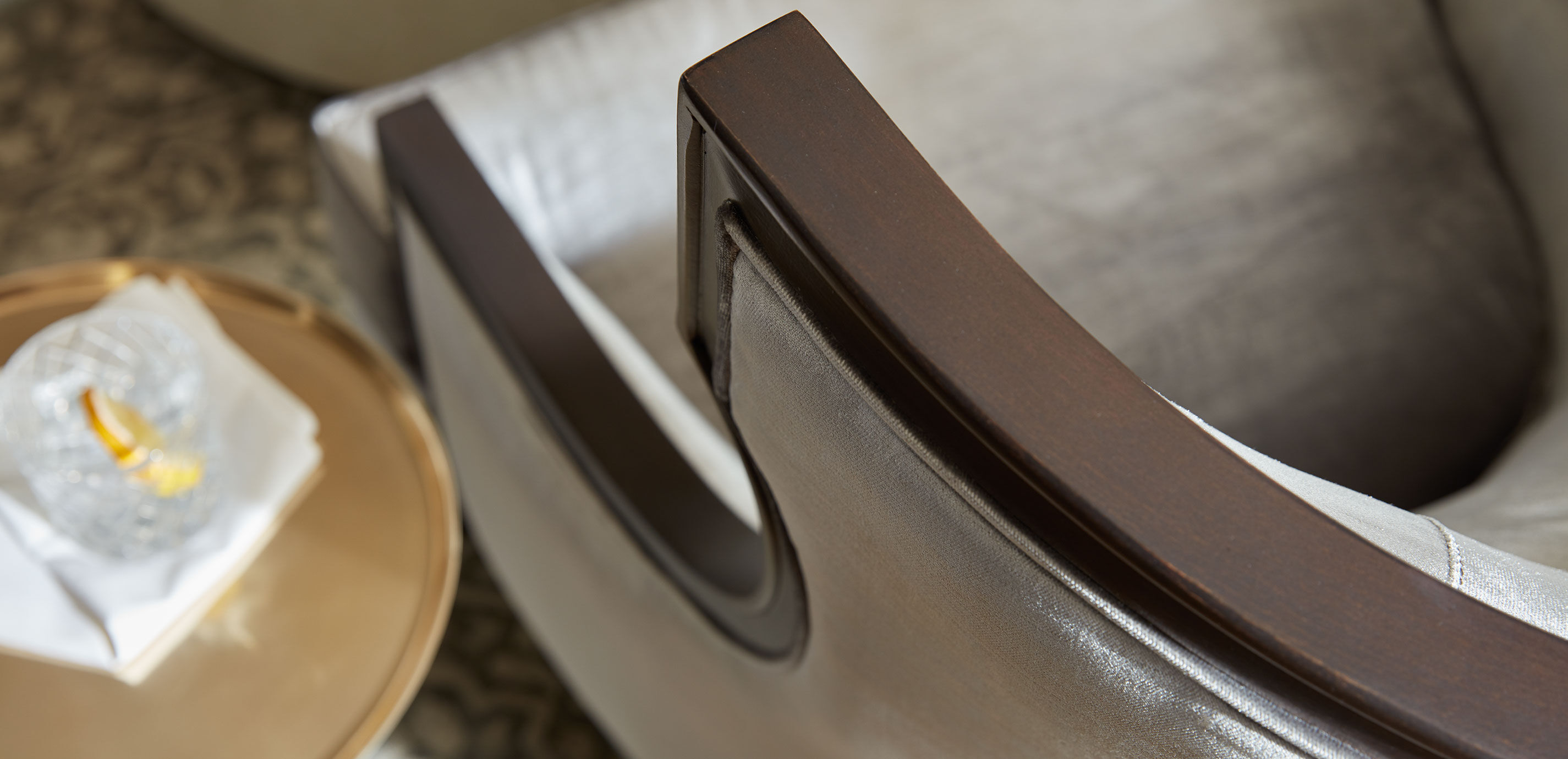 Classic klismos design meets timeless wing chair style on a bold scale. Corrine is a delight from every angle with its exposed curved wood trim, matching legs, contoured tight back, and deep cushioned seat.