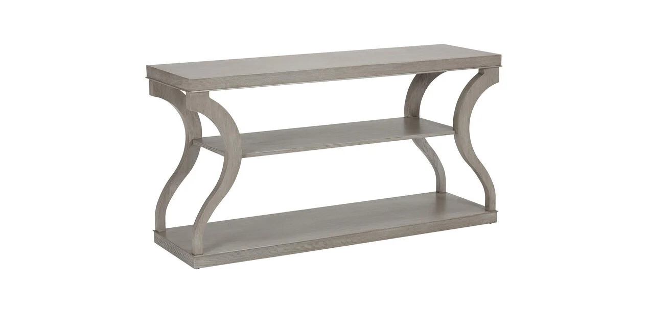 One of our most eye-catching pieces gets a fresh look in oak. This open-concept console table, with a slender middle shelf for storage, definitely has a practical side, but its curved legs and beautiful, fresh, inviting silhouette are the kind of design details that make you fall in love at first sight. No matter where Donatella stands—dining room, entryway, living room, hallway—this stylish oak console table can't help but get noticed. The Donatella console table features an open concept design and graceful curved legs; crafted from oak* and wire-brushed by hand to bring out the wood grain Console table with fixed center shelf; additional shelf space on top of its plinth base Available in Gray Flannel (483) and Sea Salt (723), two on-trend finishes that coordinate beautifully with other Ethan Allen furnishings