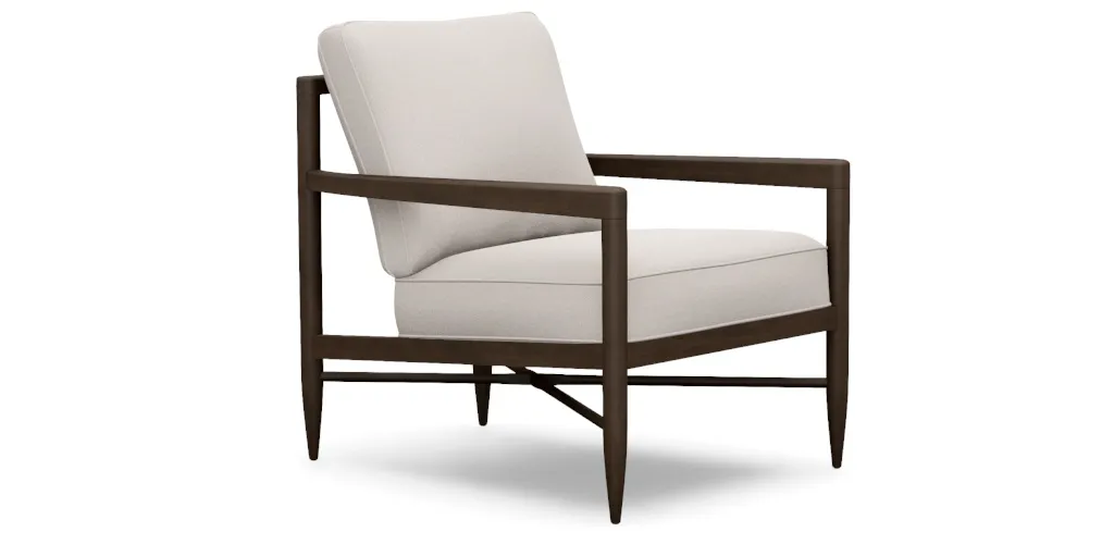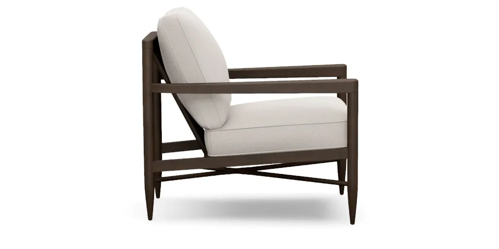 Elgin offers a narrow exposed wood frame, curved arms, and deep-pitched seat with cross stretchers. It has a striking mid-century modern design style with a comfortable, casual vibe. Hand-tailored in our North American workshops.