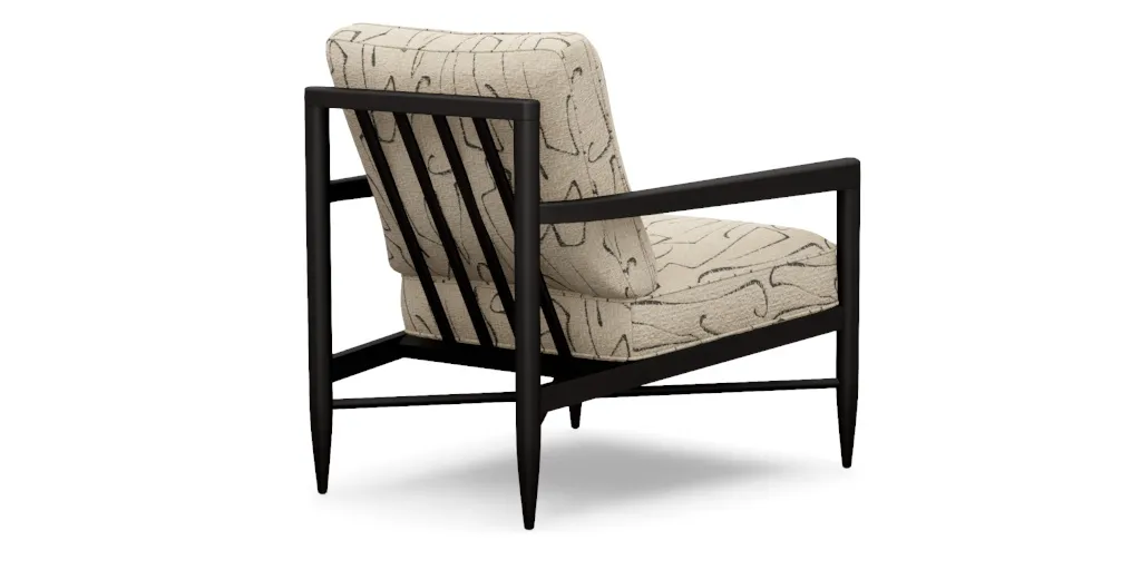 Elgin offers a narrow exposed wood frame, curved arms, and deep-pitched seat with cross stretchers. It has a striking mid-century modern design style with a comfortable, casual vibe. Hand-tailored in our North American workshops.