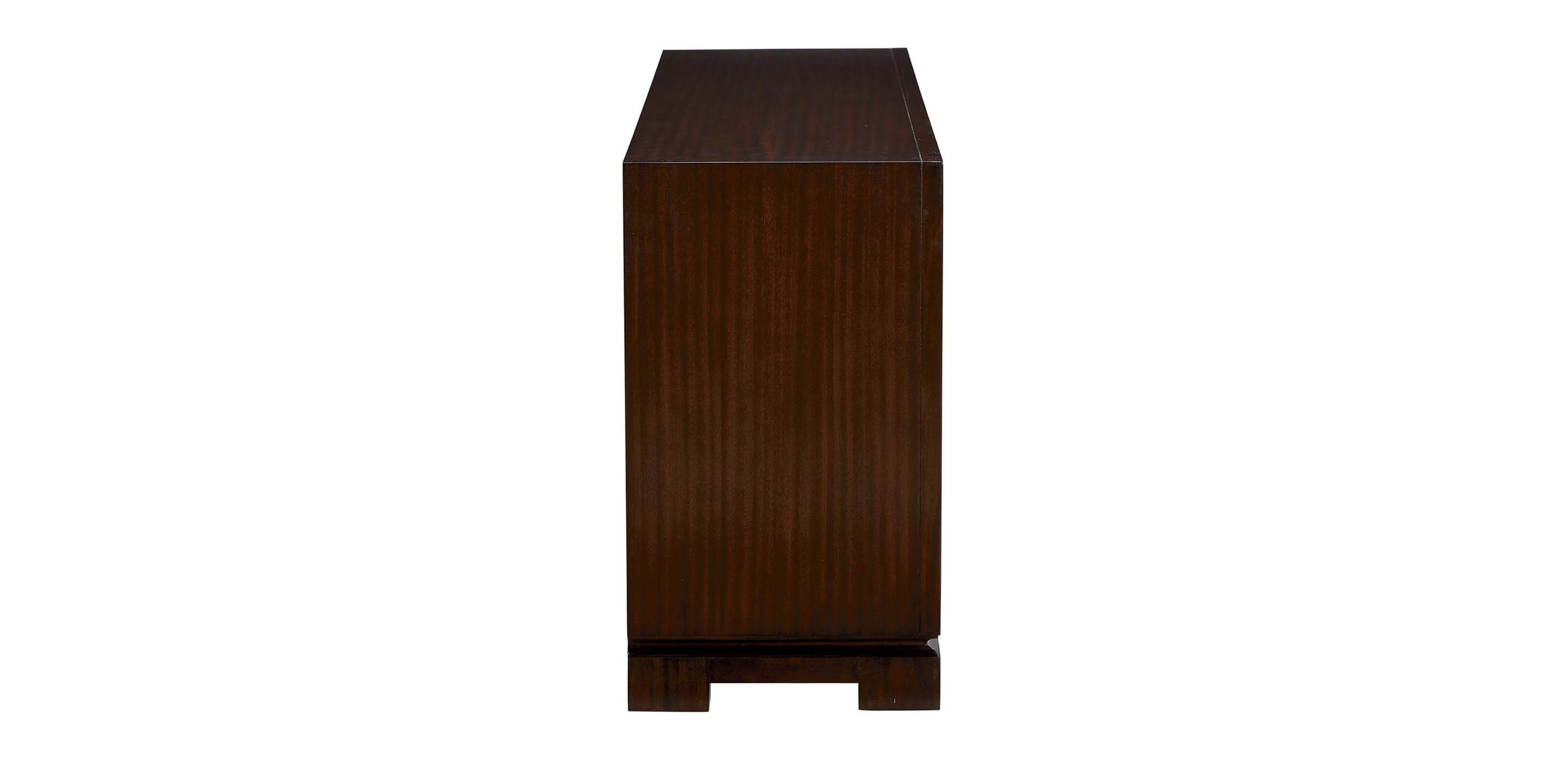 If there were an award for Outstanding Storage in a Dining Room, the Evansview dining room buffet would win it. It's gorgeous, with its gleaming sapele veneers, its minimalist perimeter accent, and its striking decorative grille. It's also an extraordinarily roomy wood sideboard, with its two side cabinets and extraordinarily versatile: It's ventilated to double as a media cabinet, so it can work in your living room or bedroom, too. The Evansview wooden buffet, for your consideration—we think you're going to love it. Crafted from Indonesian mahogany, engineered hardwoods and ribbon stripe sapele veneers A warm, dark brown stain with black undertones and a high-gloss sheen Ribbon stripe sapele veneers are applied vertically on the two doors and horizontally on the drawers Three storage drawers Center drawer features decorative grill in a champagne brass finish Two doors open to reveal one fixed shelf Back-panel cutouts for venting and cord management Push to open touch latch hardware A tip-restraint kit is included with this item. It includes safety-tested hardware, a nylon strap, and mounting instructions. Furniture tip-over can cause serious injuries; for your safety, please affix this item securely to the wall Order a finish sample: Hickory (322)