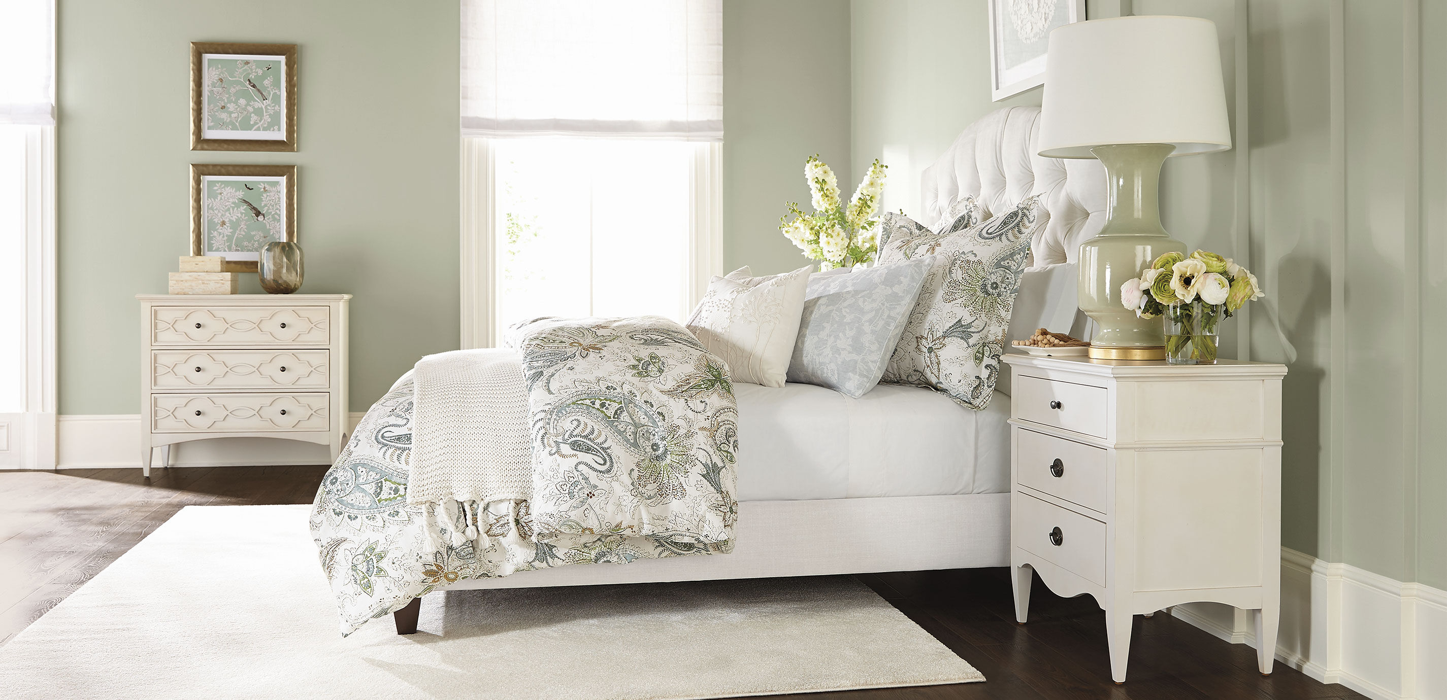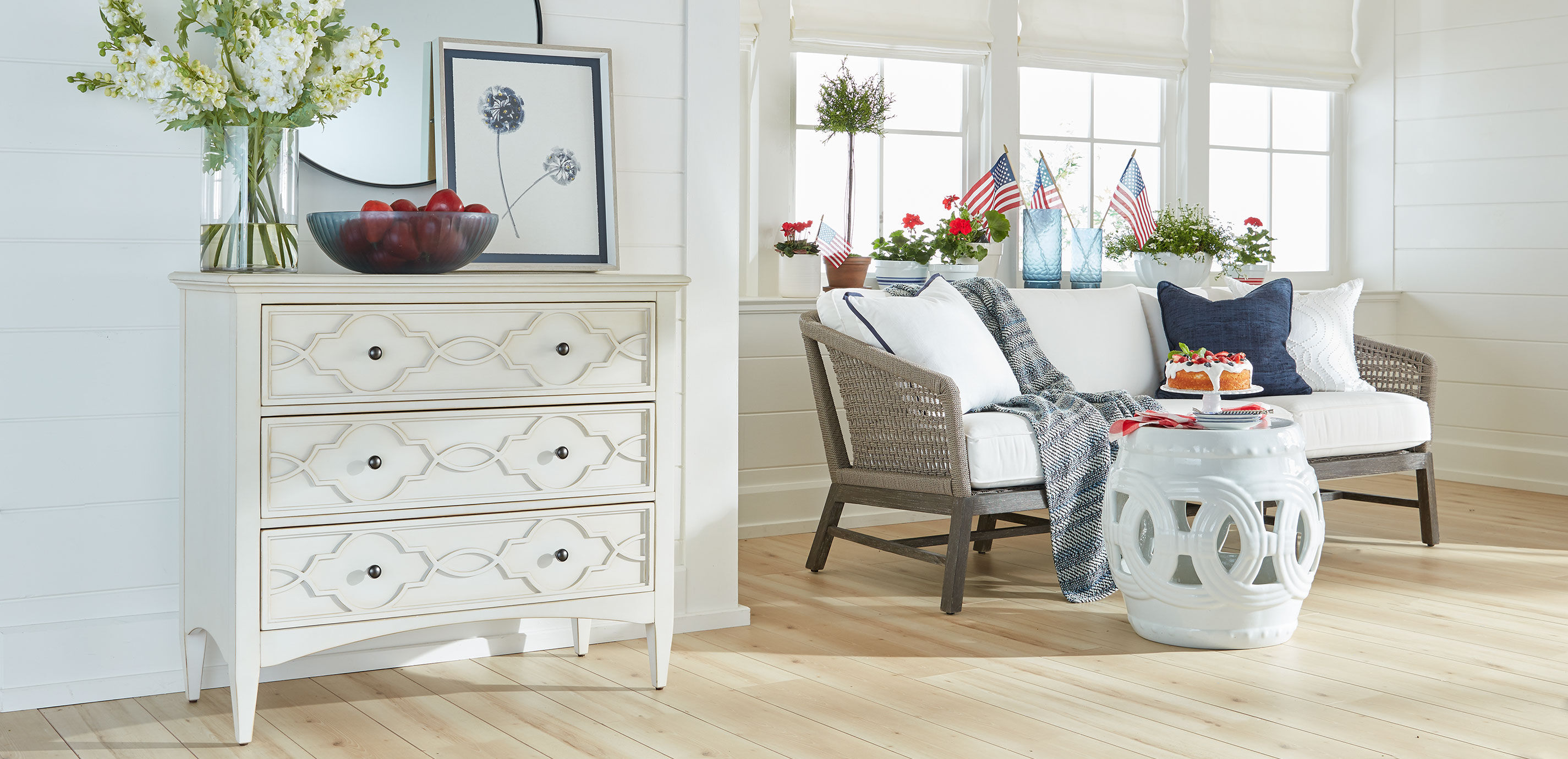 Delicate fretwork plays across the front drawers of our Eveline three-door chest. Complementing the tracery and the chest's authentic well-loved, vintage feel is its weathered painted finish and "worn" edges. Painted three-drawer chest with vintage-inspired appeal Crafted from solid Indonesian mahogany and veneers Three soft-closing drawers, with detailed tracery fretwork on drawer fronts Black nickel hardware Available in Weathered Ivory (423) and Weathered Rain Blue (427) finishes Furniture tip-over can cause serious injuries. Please use the tip-restraint kit included with this item. Click here for installation instructions.