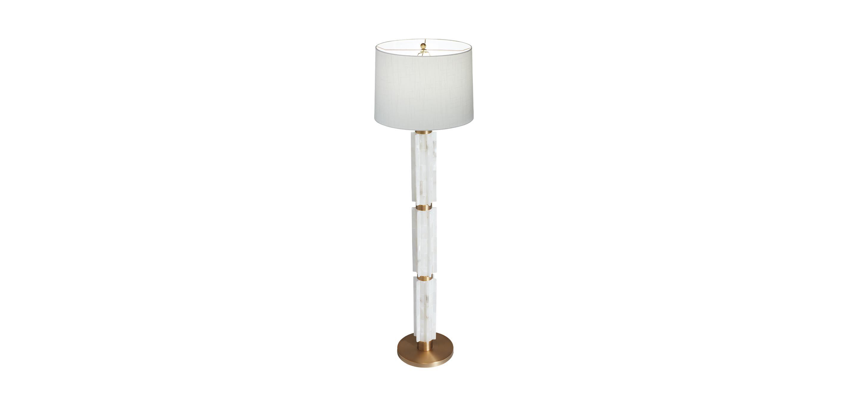 Fine alabaster pieces, selected and placed by hand, take on an otherworldly ambience when bathed in the glow of the bulb above. Our Farida alabaster floor lamp is a truly unique work of art, a luxurious statement in elegant spaces. Made of natural alabaster and antique brass finished iron Due to the organic nature of alabaster, there may be small, natural differences in texture throughout the lamp body White slubby linen shade with a rolled edge Uses one 23-watt LED bulb; three-way switch Natural alabaster material means no two are alike Shop all items in the Farida lighting collection