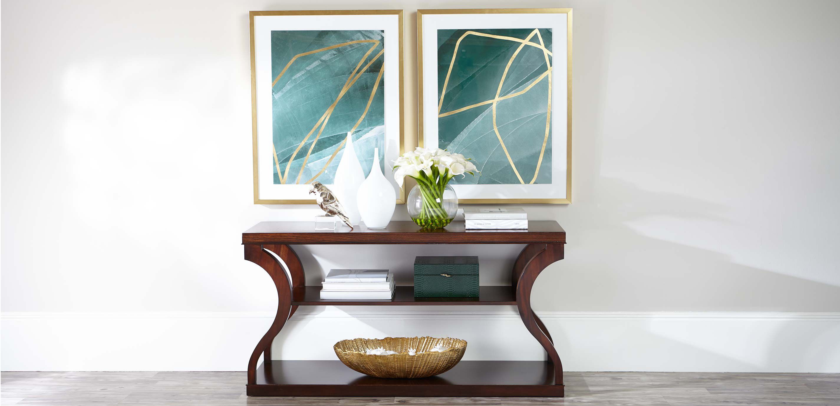 Abstract golden outlines hint at leafy forms, which are further enhanced by the tranquil tones of their emerald green background. Part of a series of two. Giclée on paper with hand-applied gold leaf, floated over a white matboard Set in a solid wood frame in a gold finish Includes everything needed for simple, safe, secure, level no-wire hanging Framed by hand by master craftspeople Each piece in this series is sold separately
