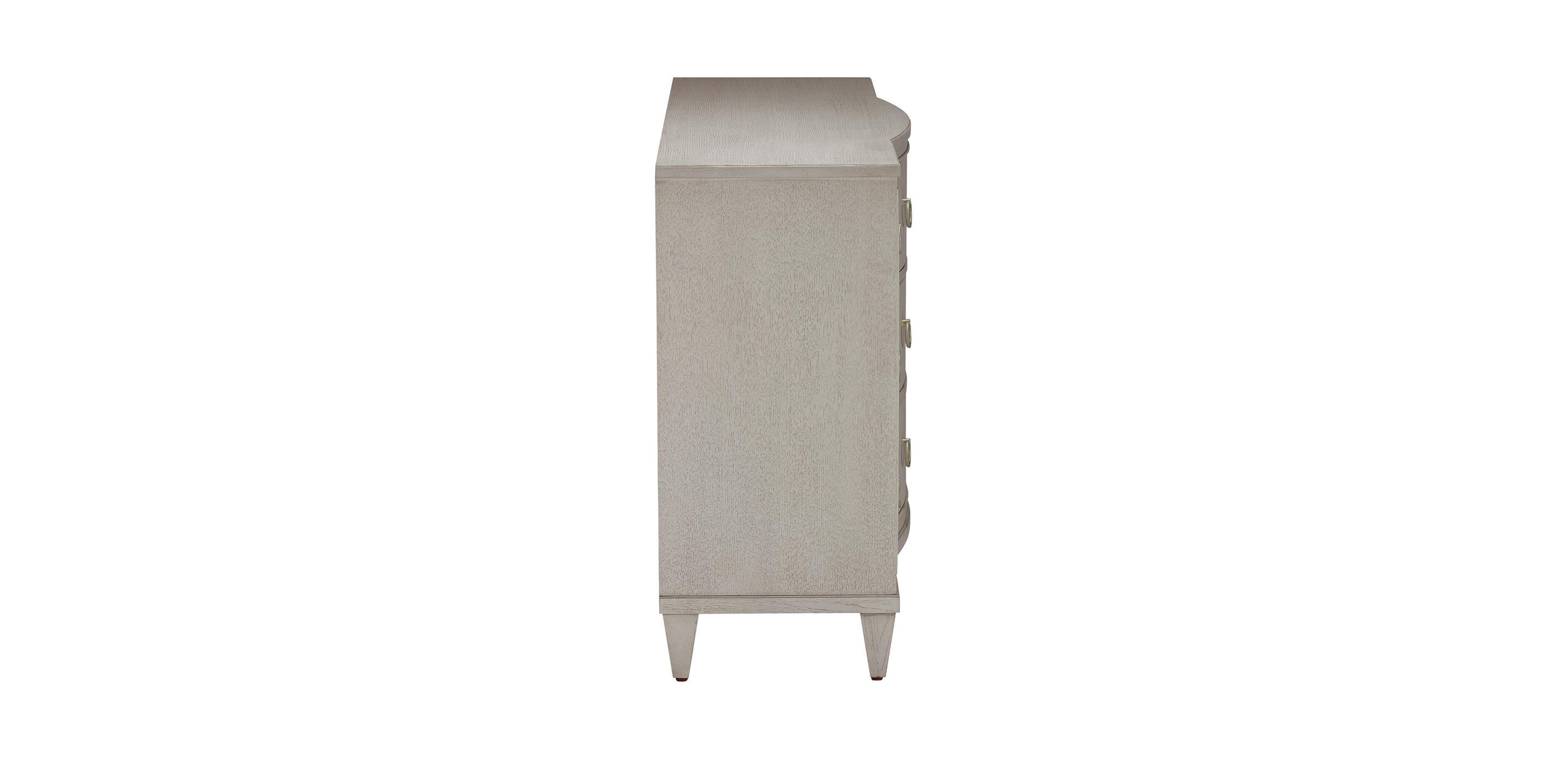 A popular triple dresser gets an all-new look. The silhouette is the same—tapered legs, bead detailing, and a gently bowed front—but the Heston oak dresser is crafted from quarter-sawn oak, which is then wire-brushed to showcase its beautiful wood grain. Elegant ring pulls, finished in warm nickel, add a relaxed yet glamorous touch. This oak nine-drawer dresser makes it easy to store your linens in style. A roomy oak triple dresser with a bowed front, beautiful in traditional and transitional spaces; crafted from quarter-sawn oak* Nine drawers, featuring vertically grained, quartered-veneer drawer fronts, surrounded by bead detailing for a designer touch Elegant pull rings in warm nickel add glam style notes Tapered legs give a classic style added transitional appeal Available in Gray Flannel (483) and Sea Salt (723) finishes, two on-trend finishes that coordinate beautifully with our other bedroom furnishings Coordinates with the Heston oak glass-top night table