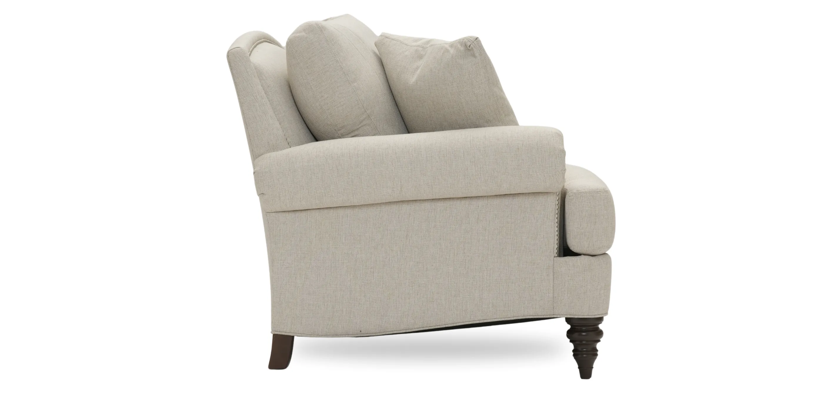The Hyde features an arched, raised back, roll-arms, and loose double needle stitched back and seat cushions