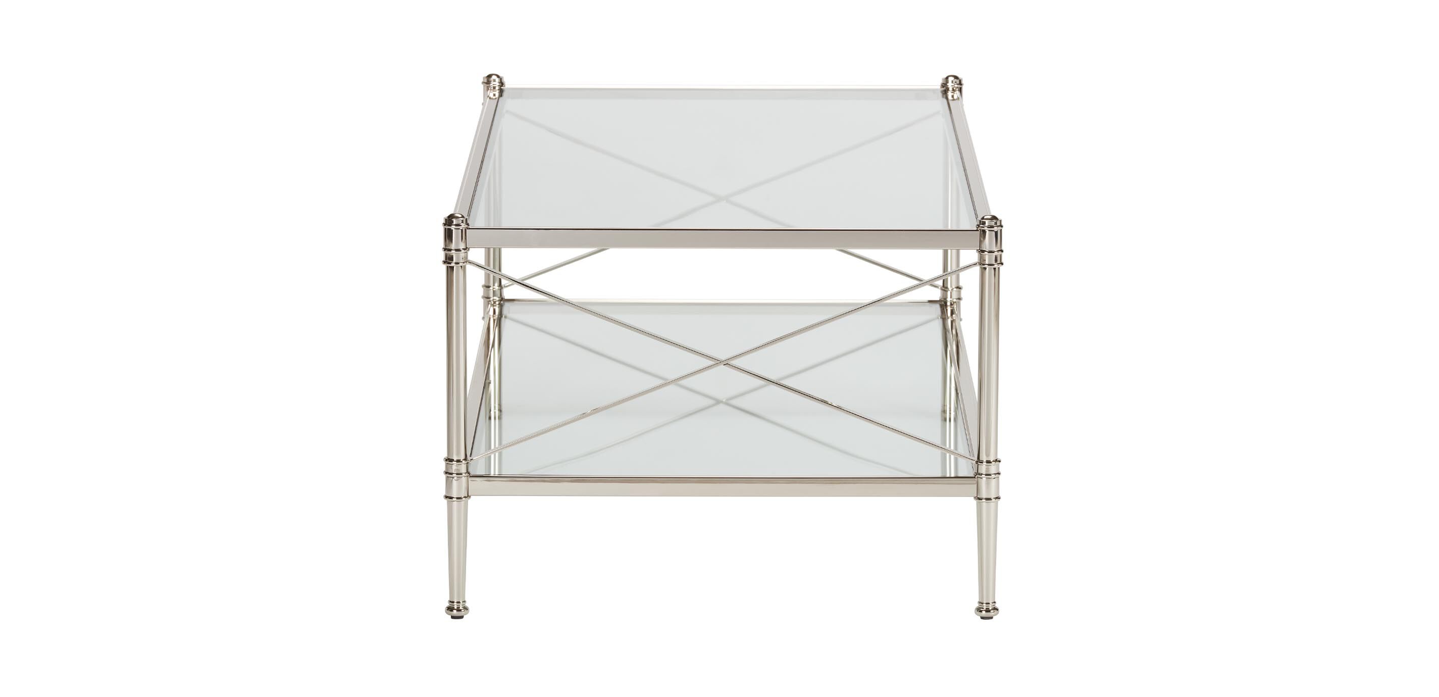 Bring a touch of Old Hollywood sparkle into the center of your living room. Artisan-crafted from steel and finished in either nickel or bronze, our Jocelyn coffee table has a sweeping X motif on either side and a lower glass shelf for storage and display. Metal and glass coffee table with clear Old Hollywood inspiration; features a dazzling X motif Frame crafted from steel. Shelf and top crafted from tempered glass. Choose from two finishes: Cufflink (115) or Smoky Bronze (145). Also available: Jocelyn Side Table (128356), End Table (128353), Console (128357), Étagère (129358), and Serving Cart (128359)