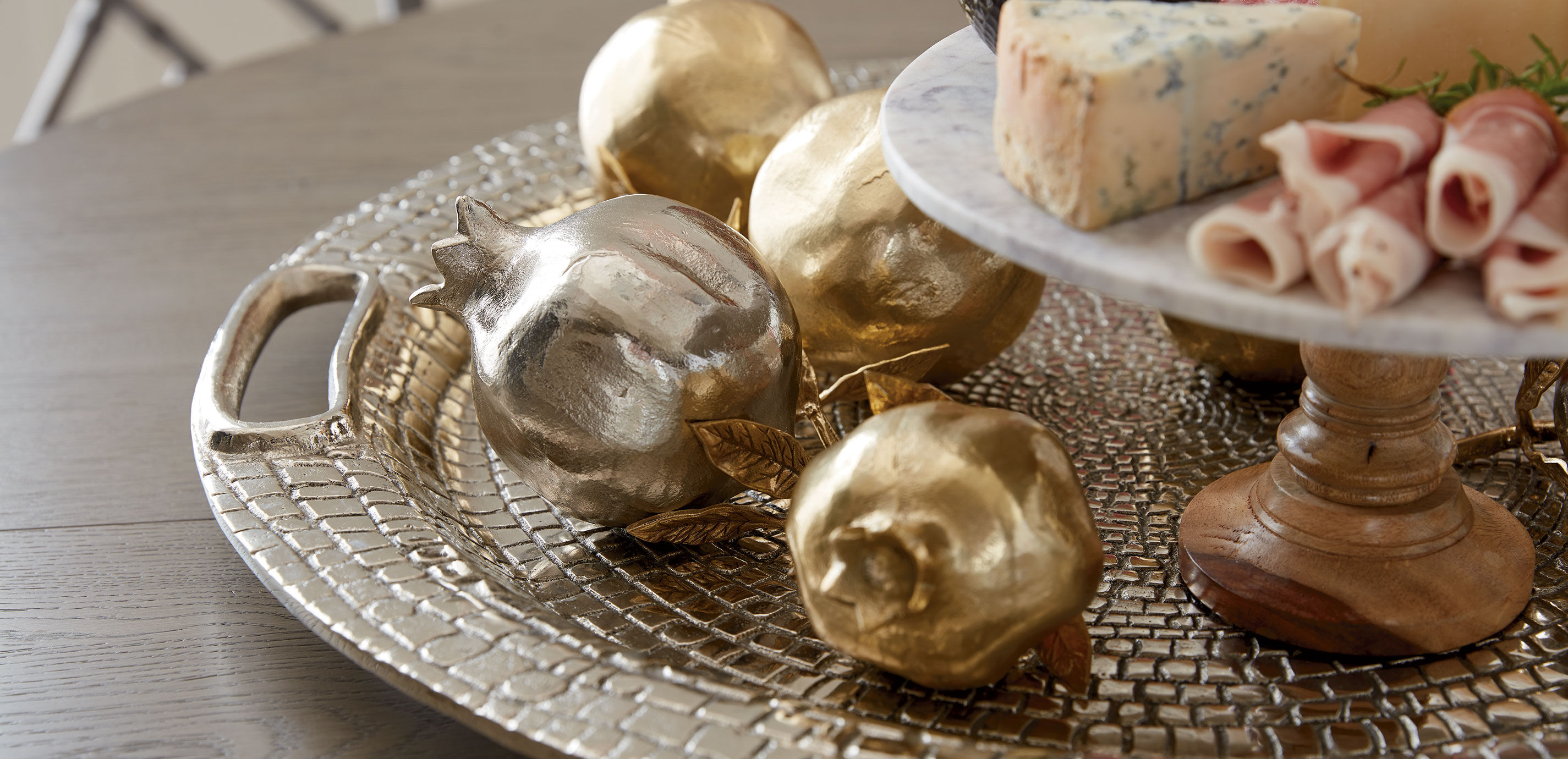 In a Greek myth, pomegranate seeds are the reason the earth blooms for six months and is barren for the rest. In China, it's been a symbol of fertility, and in ancient Egypt, one of prosperity. It's even the fruit of a nation (Armenia, if you're wondering). Spin your own tales or just admire the lush beauty captured in our hand-finished aluminum pomegranates – large or small, in nickel or gold finishes. Made of aluminum Nickel finish Molded pomegranate replica Available in 2 sizes