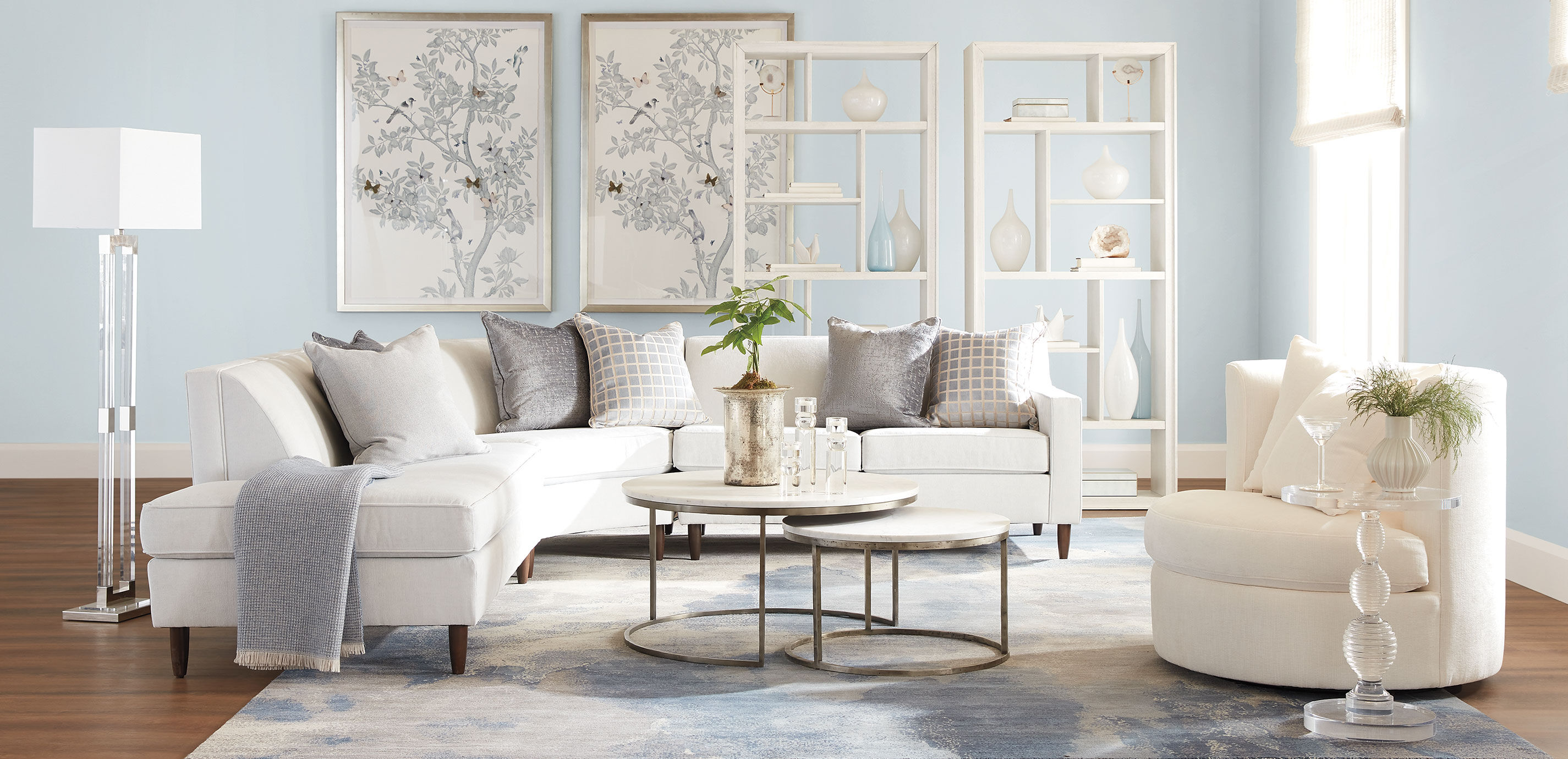 This sculptural floor lamp is a modern interpretation of the 1960s campaign-style lamp. Its structured, clear acrylic frame is accented with polished nickel cuffs for surprising texture and detail. Finished with a polished nickel square base and crisp white rectangular shade, it delivers a striking yet spacious style that stands beautifully in the bedroom or in the living room flanking a sofa.