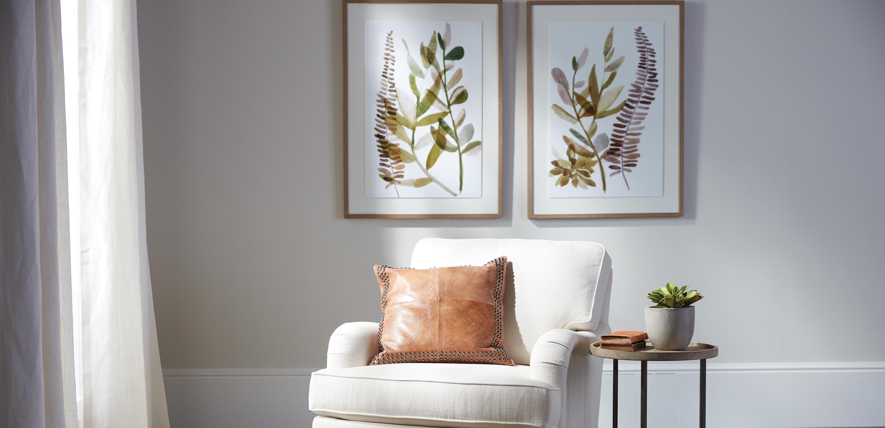 Taken down to its most elemental form, the graceful fern is gently rendered in soft watercolor brushstrokes in this serene giclée on paper. The piece of fern wall art has a dreamy, barely-there quality thanks to the transparency of the paint and the artist’s choice of a muted, green and brown palette. This is one of two in a series; hang them together to bring a bit nature into any room. Giclée on deckle-edge paper; image floated over a white mat board Set in a solid wood frame with a wood grain finish Includes everything needed for simple, safe, secure, level, no-wire hanging Framed by hand by master artisans who specialize in framing techniques