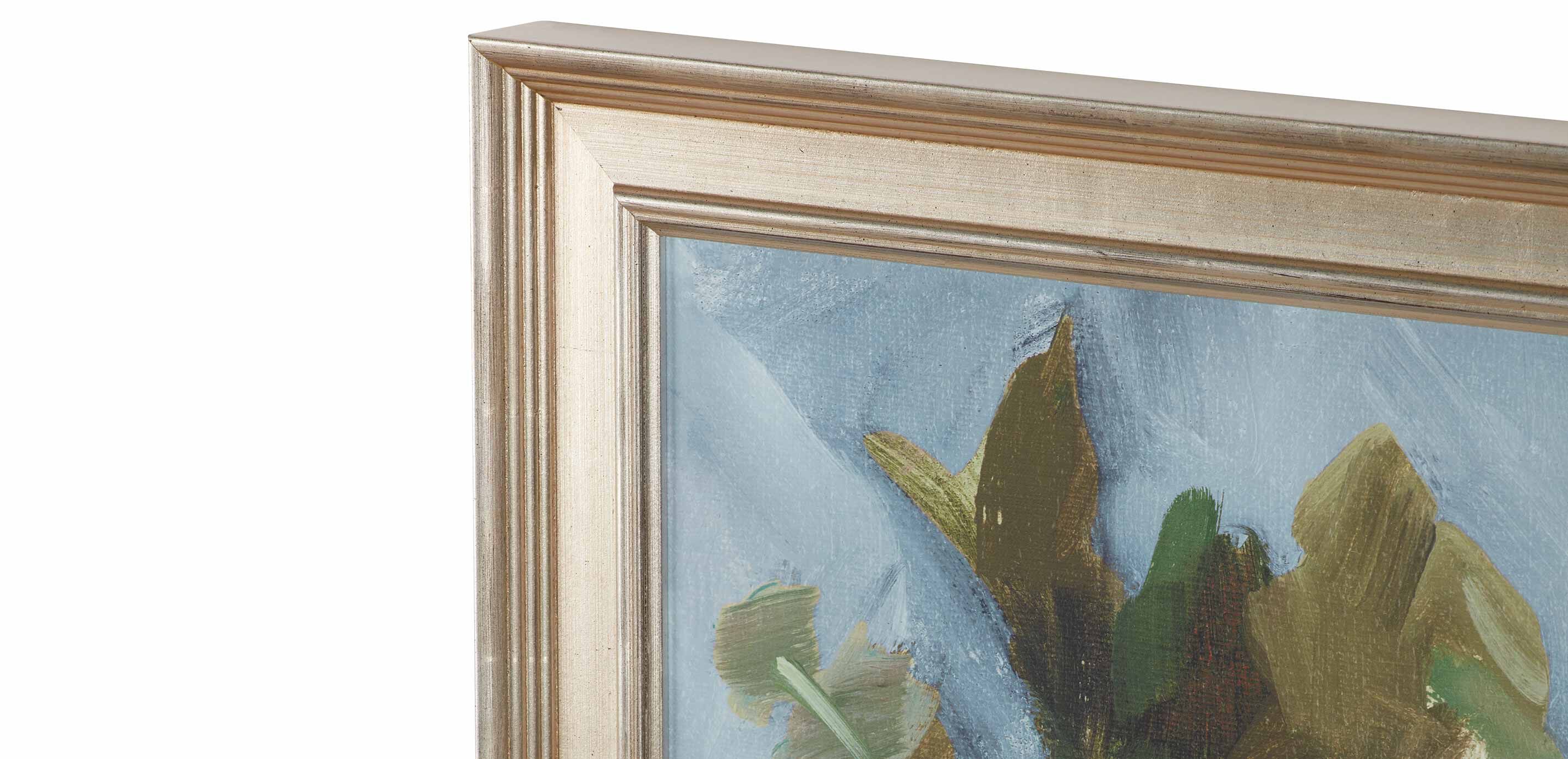 A classic white floral arrangement set against a dreamy wash of blue. This effortless combination, with its laid-back elegance, will blossom in any décor. Hand-embellished giclée on canvas Set in a contemporary solid wood frame in a warm silver finish Includes everything needed for simple, safe, secure, level no-wire hanging Framed by hand by master craftspeople