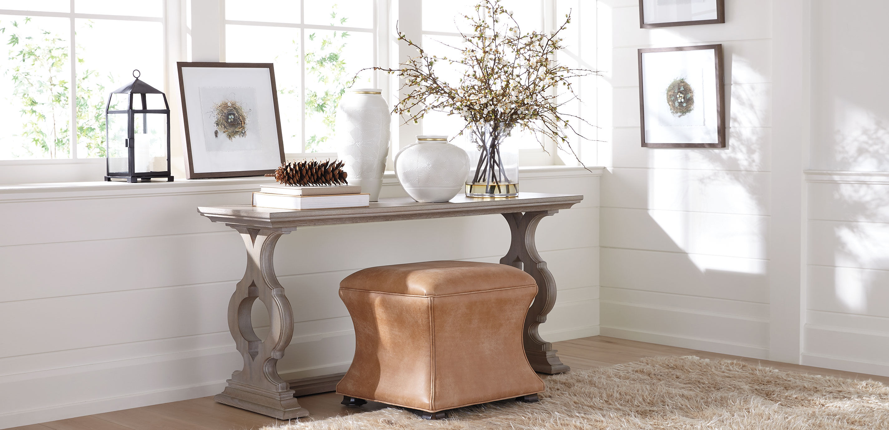 It's a sofa table, an entryway table, an anywhere-you-want-something-gorgeous table: Our dramatic Aelin console table is destined to be a timeless designer favorite. Handcrafted in our workshops, it features bold moldings and a striking ogee pedestal motif. Available in two sizes and in range of beautiful wood finishes. Console table with pedestals that feature a dramatic ogee motif Crafted from oak, or from maple or birch, depending on the finish you choose 2 size options: 60" wide with 2 pedestals, or 84" wide with 3 pedestals Additional finishes are available for order in Design Centers Please note that while samples are an excellent representation of our finishes, each piece is crafted by hand and the final finish may vary slightly from the sample. Levelers ensure stability even on uneven surfaces