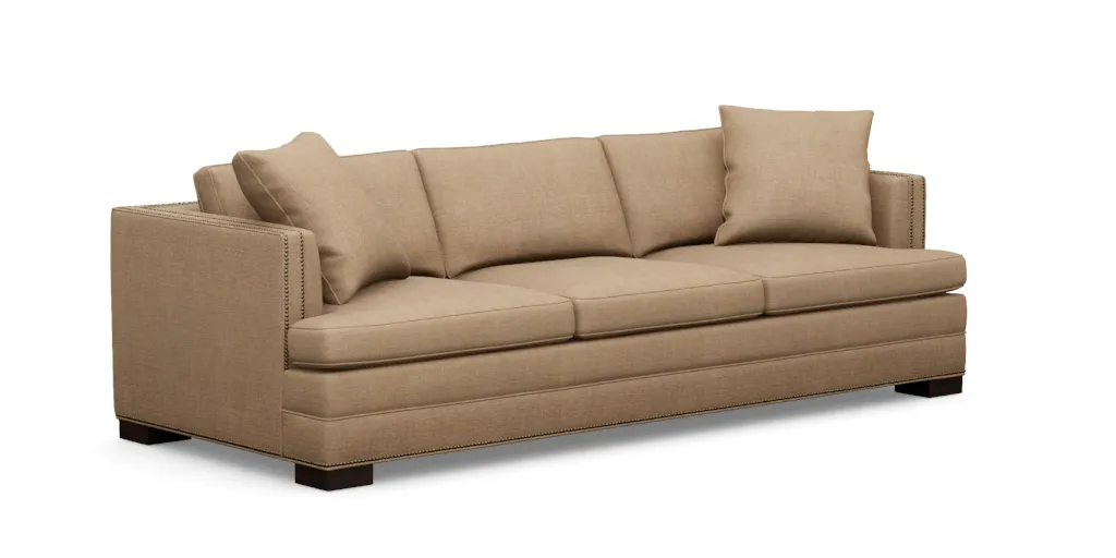 The Astor has all the trappings of a generously scaled shelter sofa, with just a touch of transitional glam (the optional double nailhead trim helps). Its streamlined profile is accentuated by slightly set back track arms that wrap around the back. Available as an 80-inch sofa and as an 89-inch sofa, Astor has architectural attitude that's softened by loose back cushions and deep T-cushions—the ultimate in modern comfort. Track arms combined with loose back cushions and deep T-cushions for tailored and timeless styling Poly-wrapped foam cushions provide a soft, structured seat; two 21" pillows included for added comfort and style versatility Engineered panel frame for superior strength and long-lasting durability Legs finished in Raisin (939), a rich, cool dark brown water-based finish Stain-resistant fabric prevents damage from spills; great choice for homes with families and pets Sleeper: Standard 80" innerspring queen mattress offers your guests a comfortable, supportive night sleep Also available in leather The fabrics and options shown here are our most popular, but if you don't see what you're looking for, visit a Design Center to view additional options