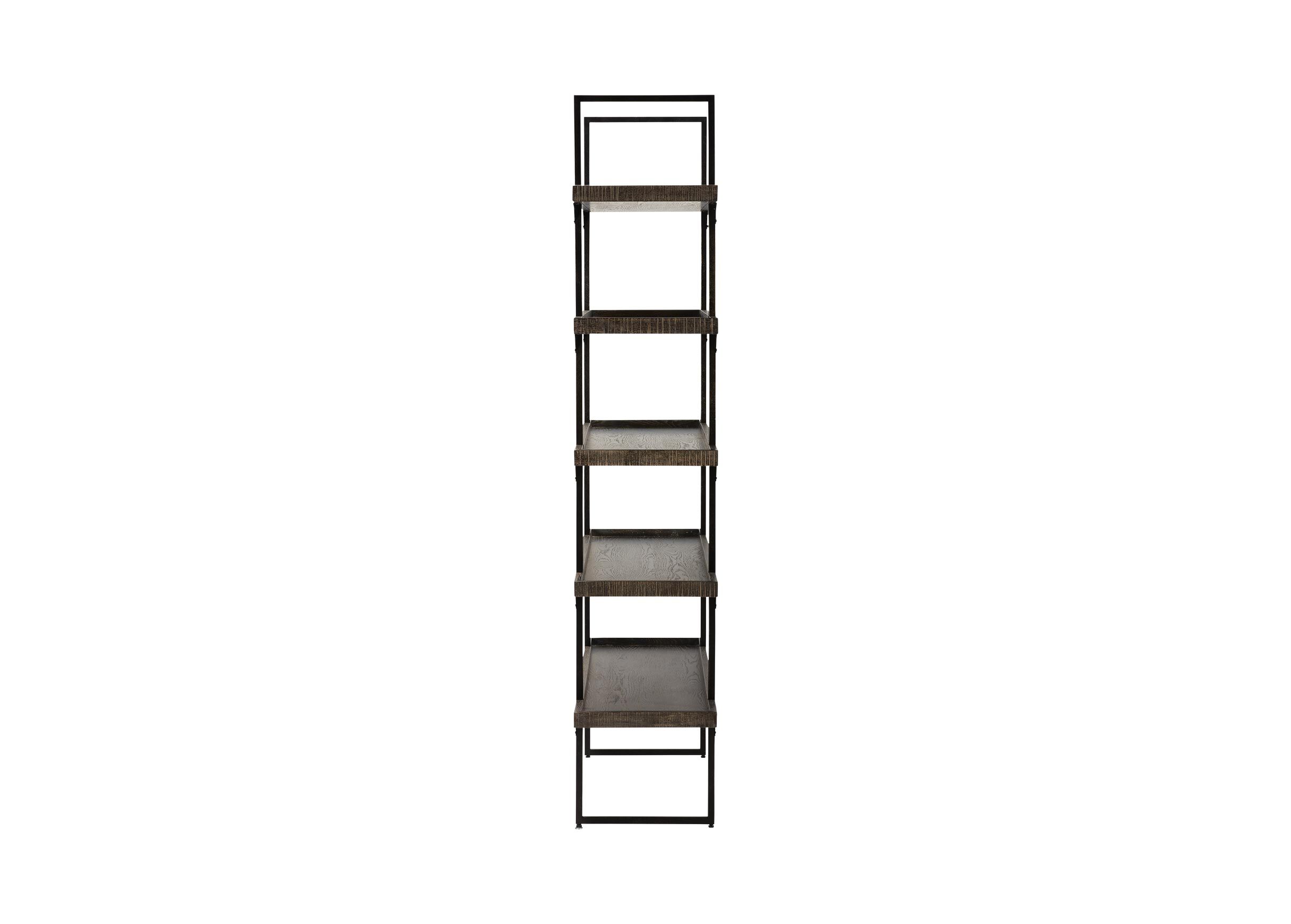 Industriously farmhouse: Textured oak and metal form a dramatic yet practical partnership in these wall display shelves. The piece makes a striking statement and provides excellent storage. Open display bookcase with a hand-hewn, hand-forged vibe Shelves crafted from oak*; brackets crafted from charcoal-colored steel Reclaimed industrial fixed shelves with five open areas for storage Available in Rustic Light Brown (491) and Rustic Sable (497) finishes Furniture tip-over can cause serious injuries; please use the tip-restraint kit included with this item. Click here for installation instructions
