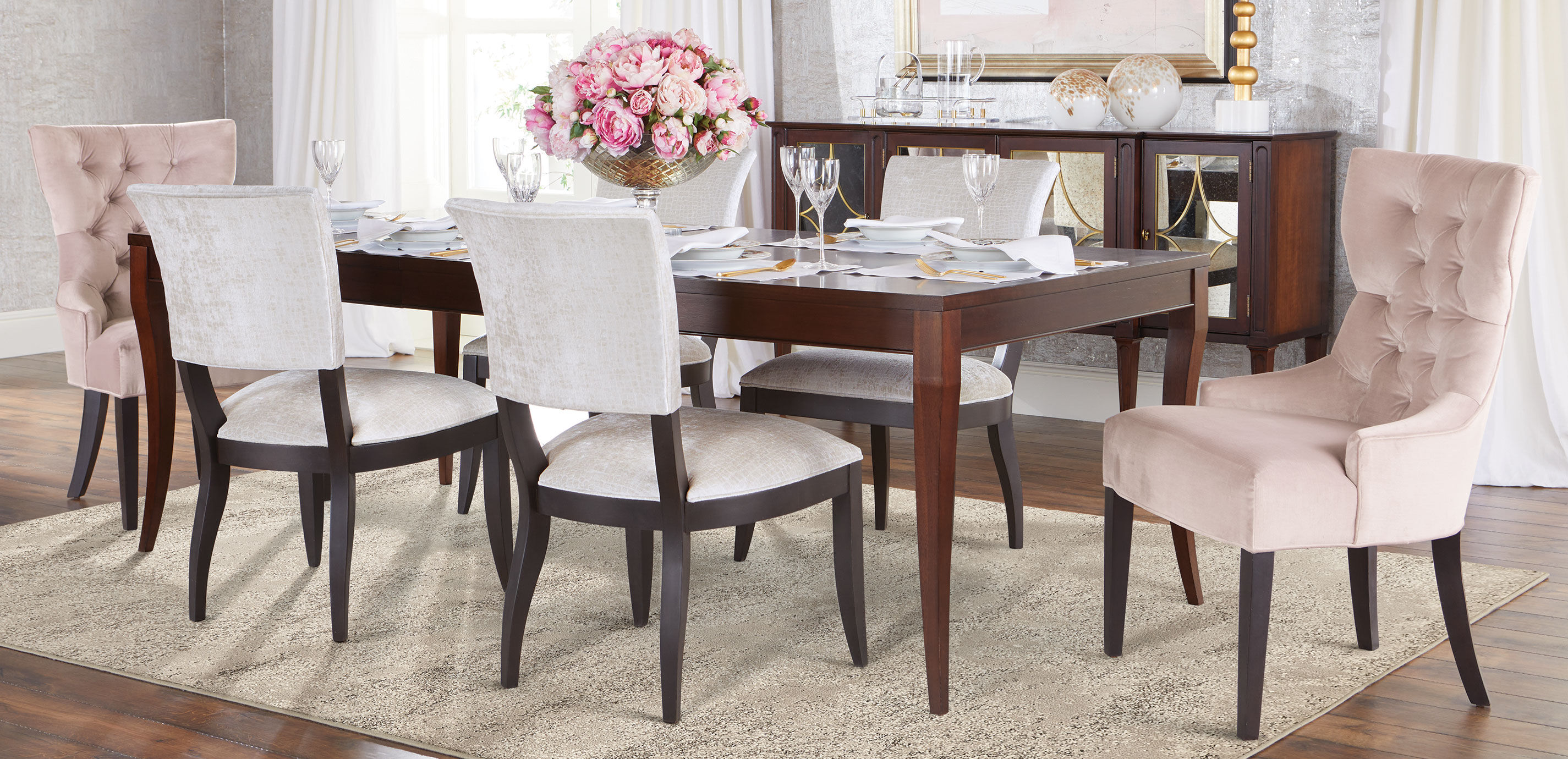 This stunning dining table will turn heads in your home. Precise lines, an exotic wood finish, and graceful saber legs come together elegantly in a chic transitional design that's simply beautiful. Crafted from mozambique and mahogany veneers with Indonesian mahogany solids* Opens to 108" with two 18" leaves, seats up to 10 Traditional design with updated, modern styling and saber-shaped legs Legs and aprons are complemented with a contrasting, decorative Mozambique veneer tabletop Available in Citrine (321), an on-trend finish that coordinates beautifully with our other dining furniture. Citrine is a cool brown stain with natural variations. Order a finish sample: Citrine (321)