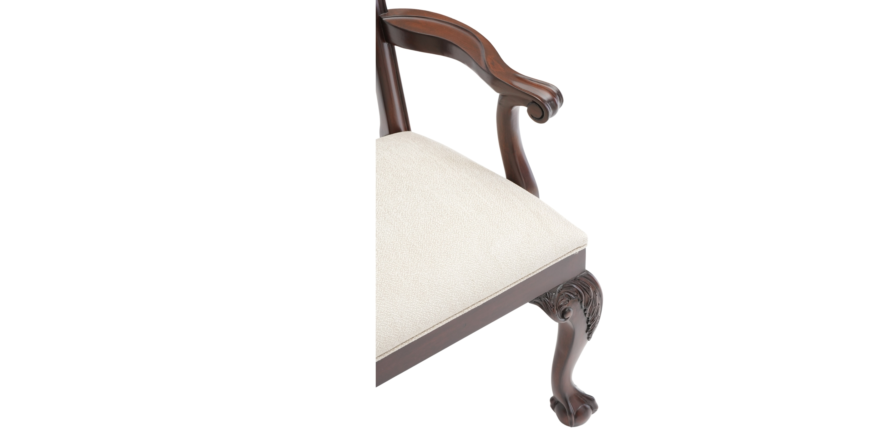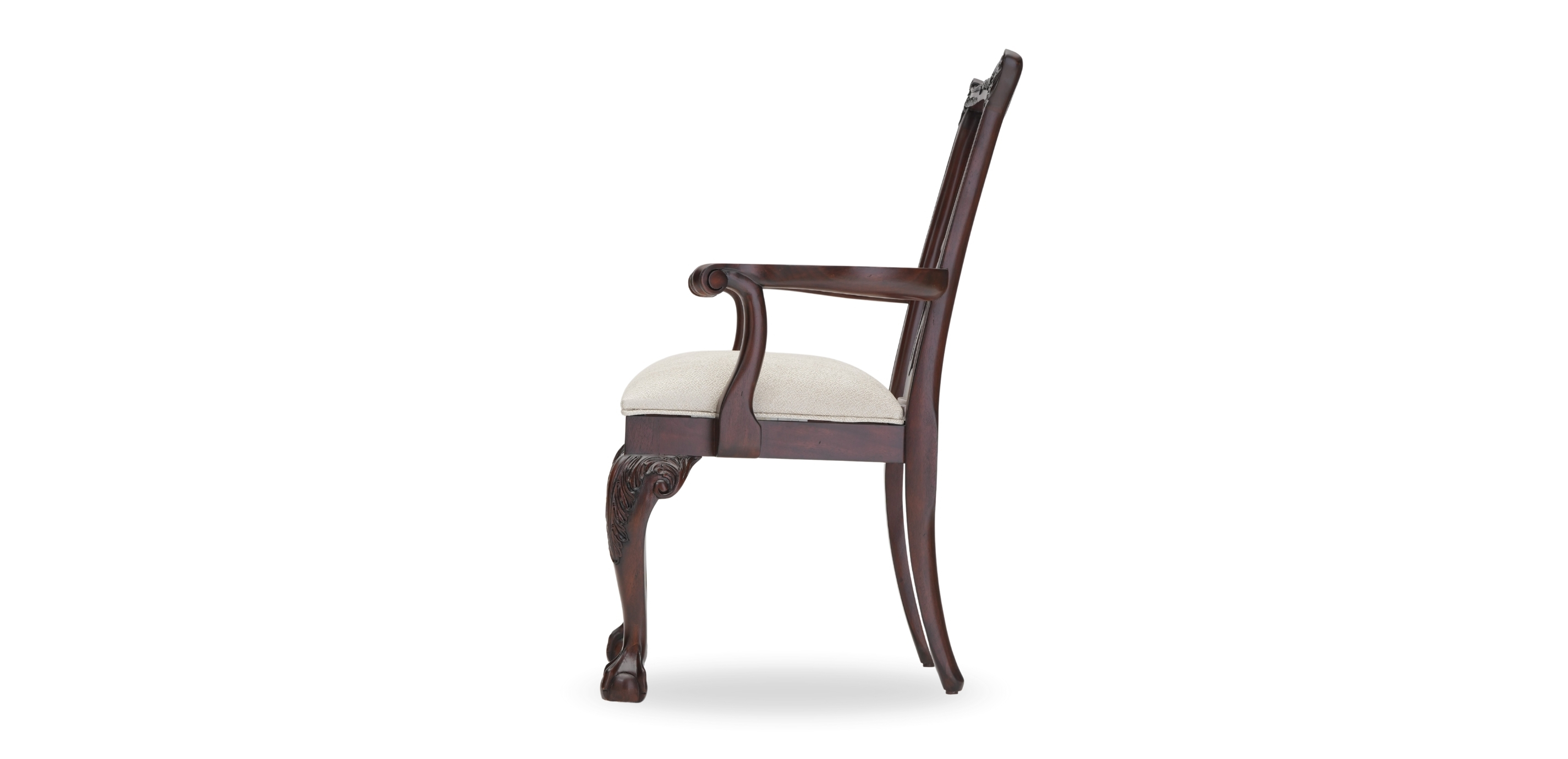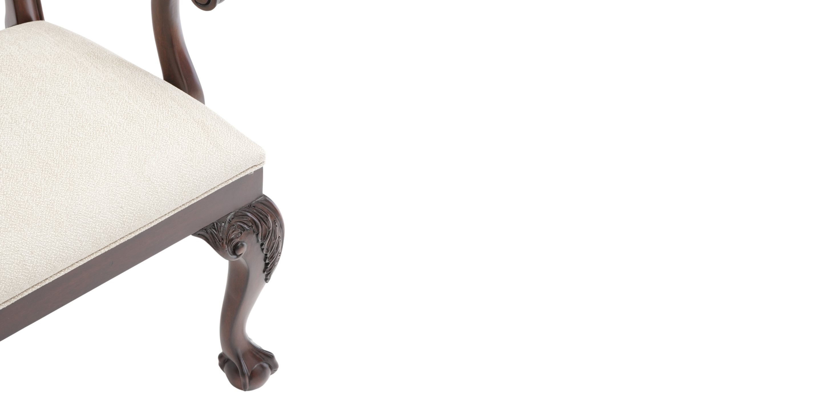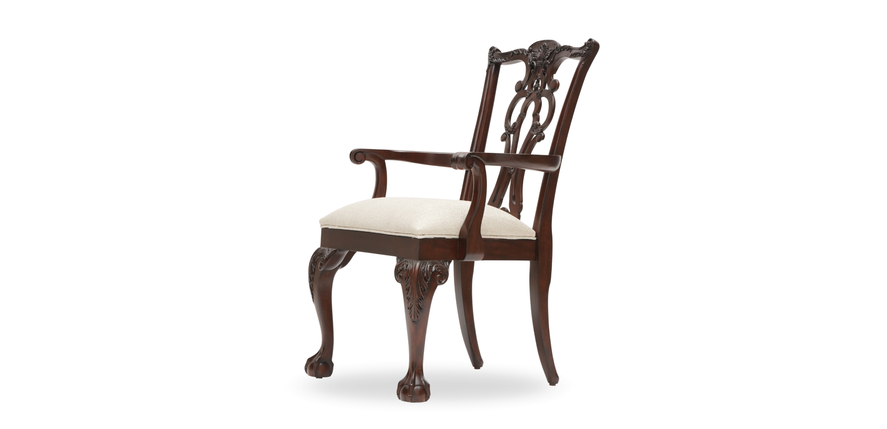 The Chippendale gets a facelift. Intricate rococo carvings climb the back rails and dress the substantial front cabriole legs of the Chauncey chair. Georgian shell and acanthus leaf scrolling fretwork liberate this version from its traditional roots.