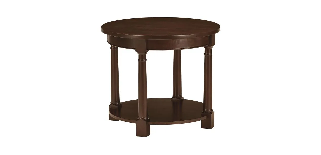 Handcrafted in our North American workshops and now available for fast delivery in select finishes. Connall's round frame includes a lower open shelf; neoclassical posts raise the elegance factor. Combines beautifully with any of our Quick Ship Connall coffee tables.