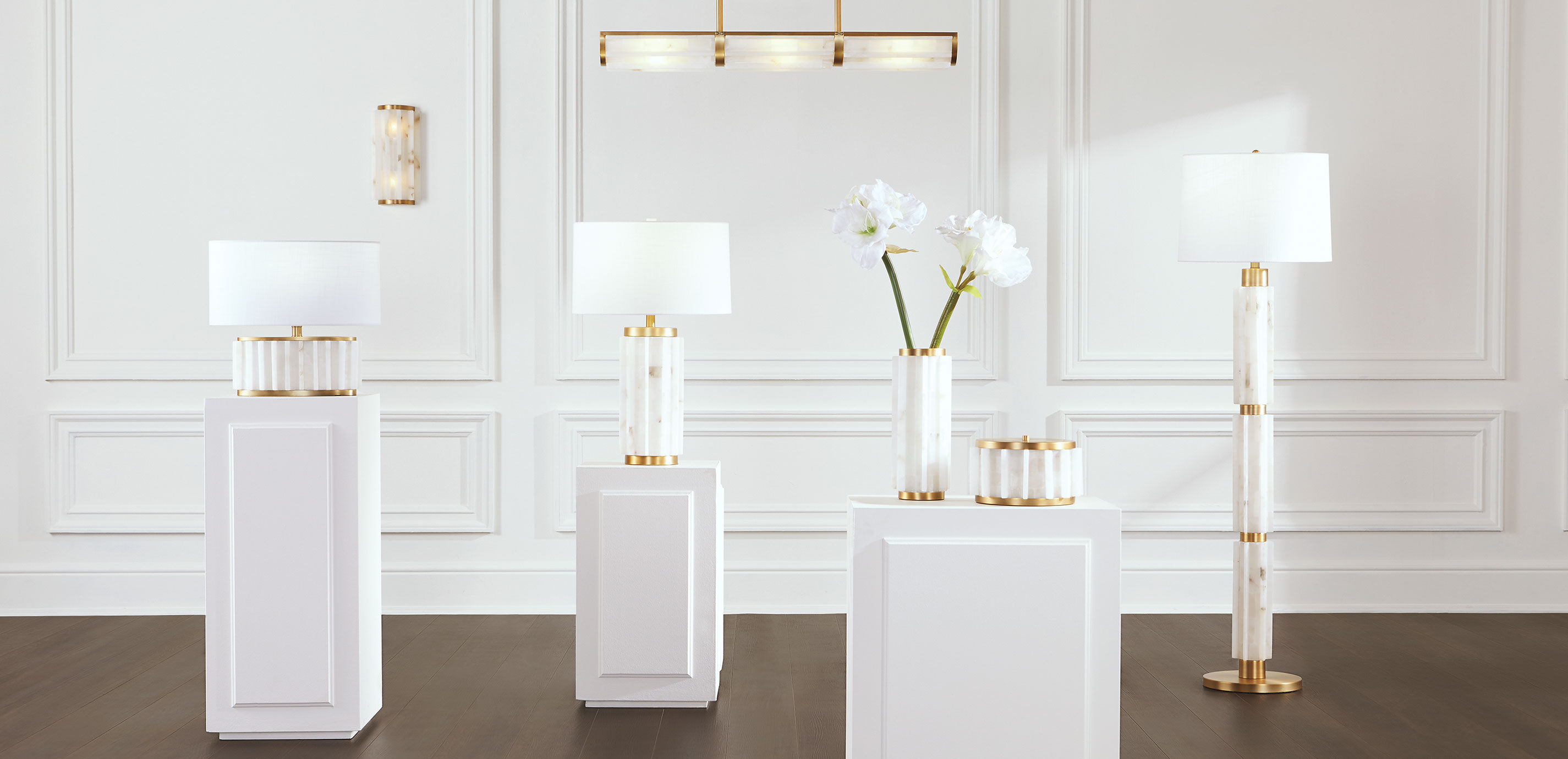 Fine alabaster pieces, selected and placed by hand, take on an otherworldly ambience when bathed in the glow of the bulb above. Our Farida alabaster floor lamp is a truly unique work of art, a luxurious statement in elegant spaces. Made of natural alabaster and antique brass finished iron Due to the organic nature of alabaster, there may be small, natural differences in texture throughout the lamp body White slubby linen shade with a rolled edge Uses one 23-watt LED bulb; three-way switch Natural alabaster material means no two are alike Shop all items in the Farida lighting collection