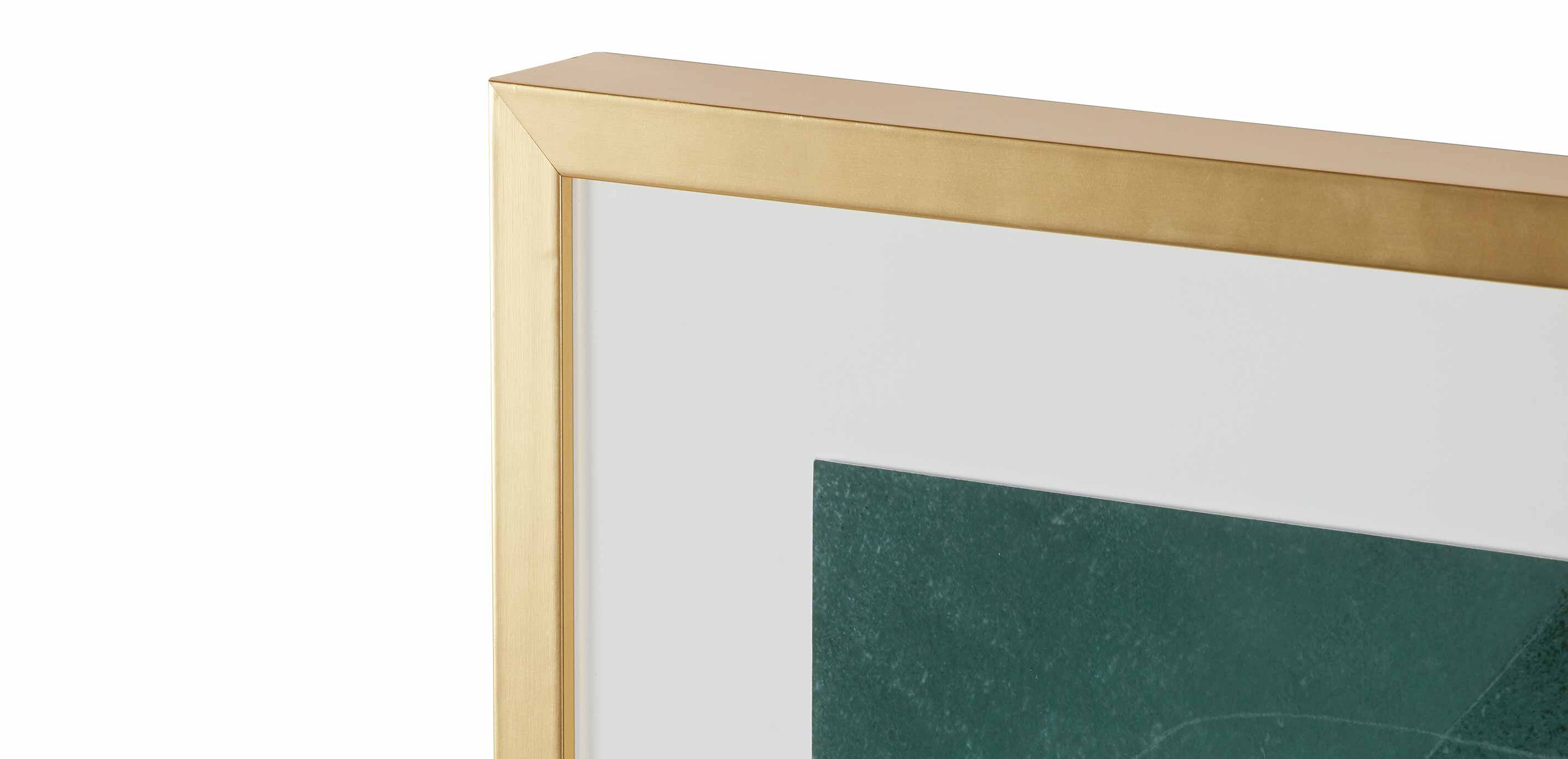 Abstract golden outlines hint at leafy forms, which are further enhanced by the tranquil tones of their emerald green background. Part of a series of two. Giclée on paper with hand-applied gold leaf, floated over a white matboard Set in a solid wood frame in a gold finish Includes everything needed for simple, safe, secure, level no-wire hanging Framed by hand by master craftspeople Each piece in this series is sold separately