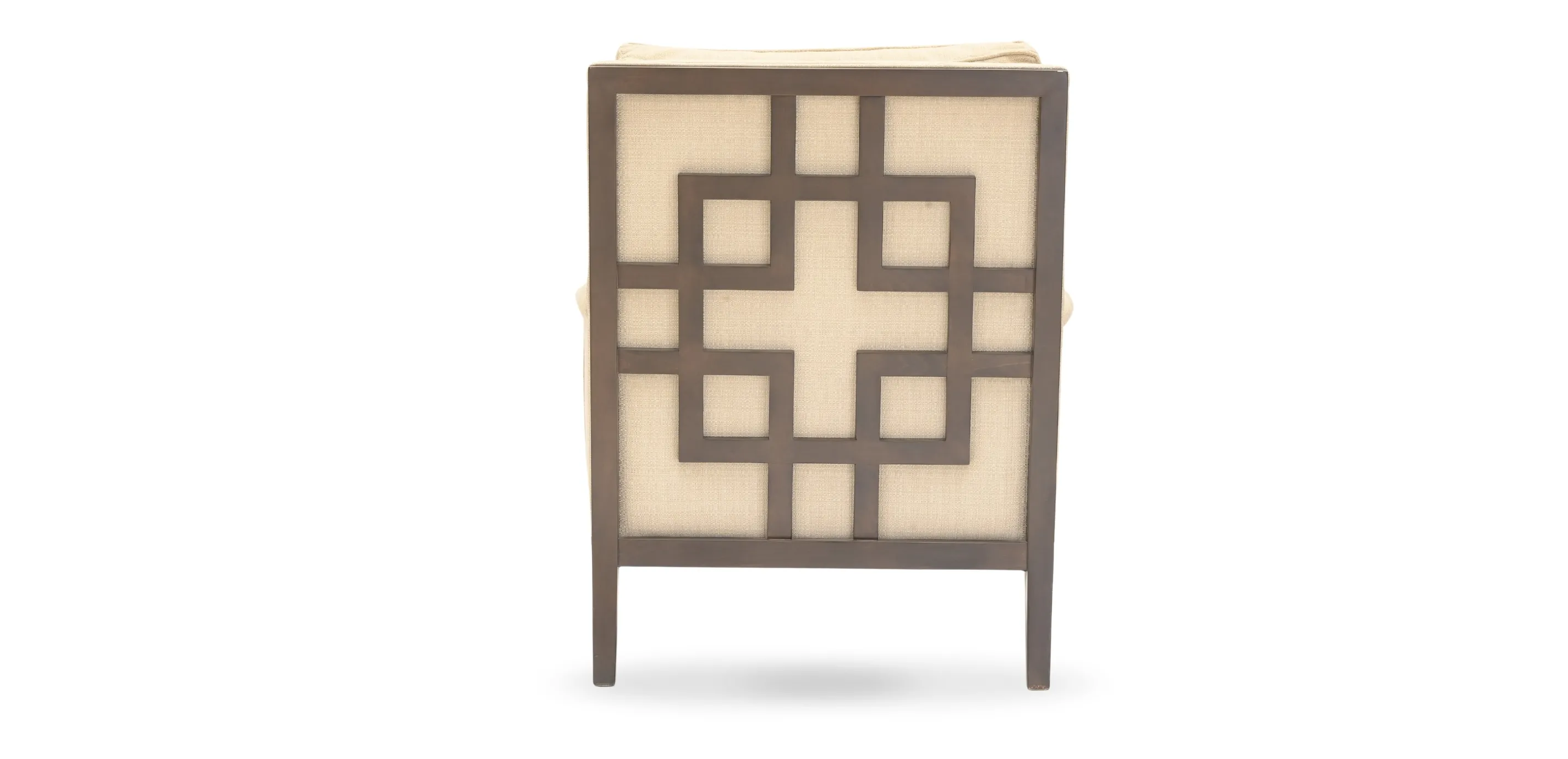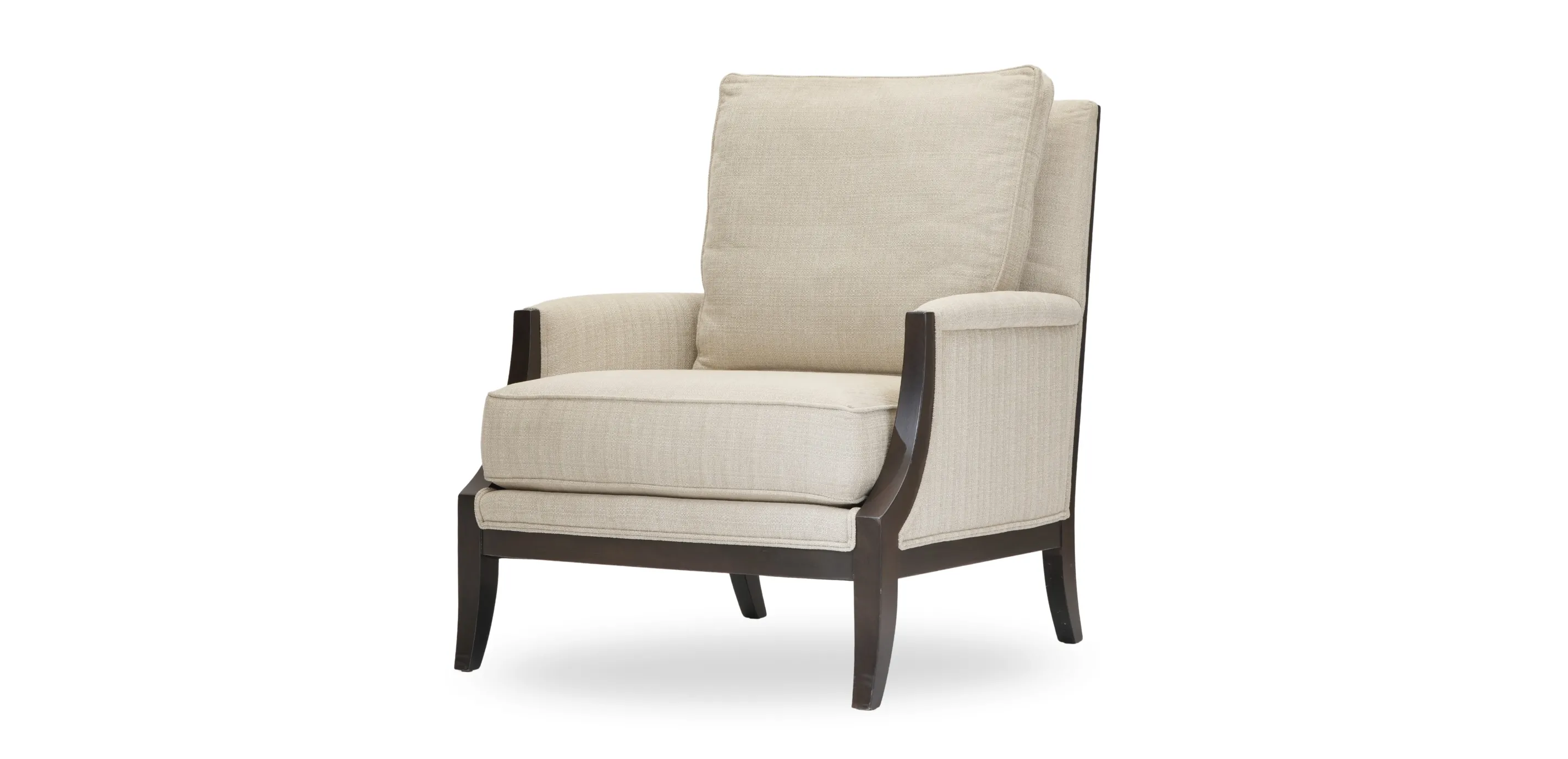 Graphically inspired, this chair has an edgy look with its exposed curved wood frame and flared legs, and Chippendale-influenced styling. A comfortable loose back and well cushioned seat ensure it is destined to become a favorite respite.