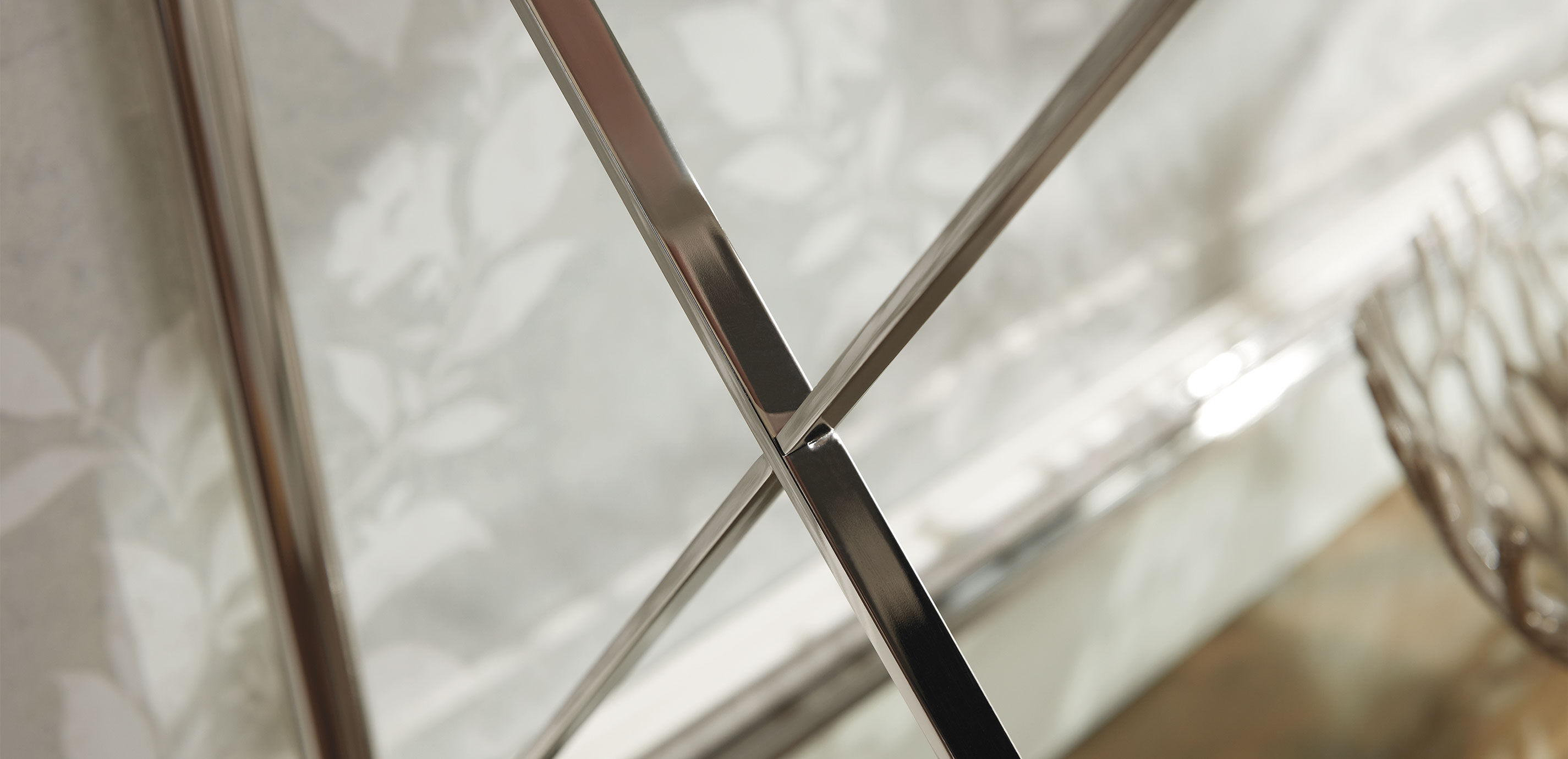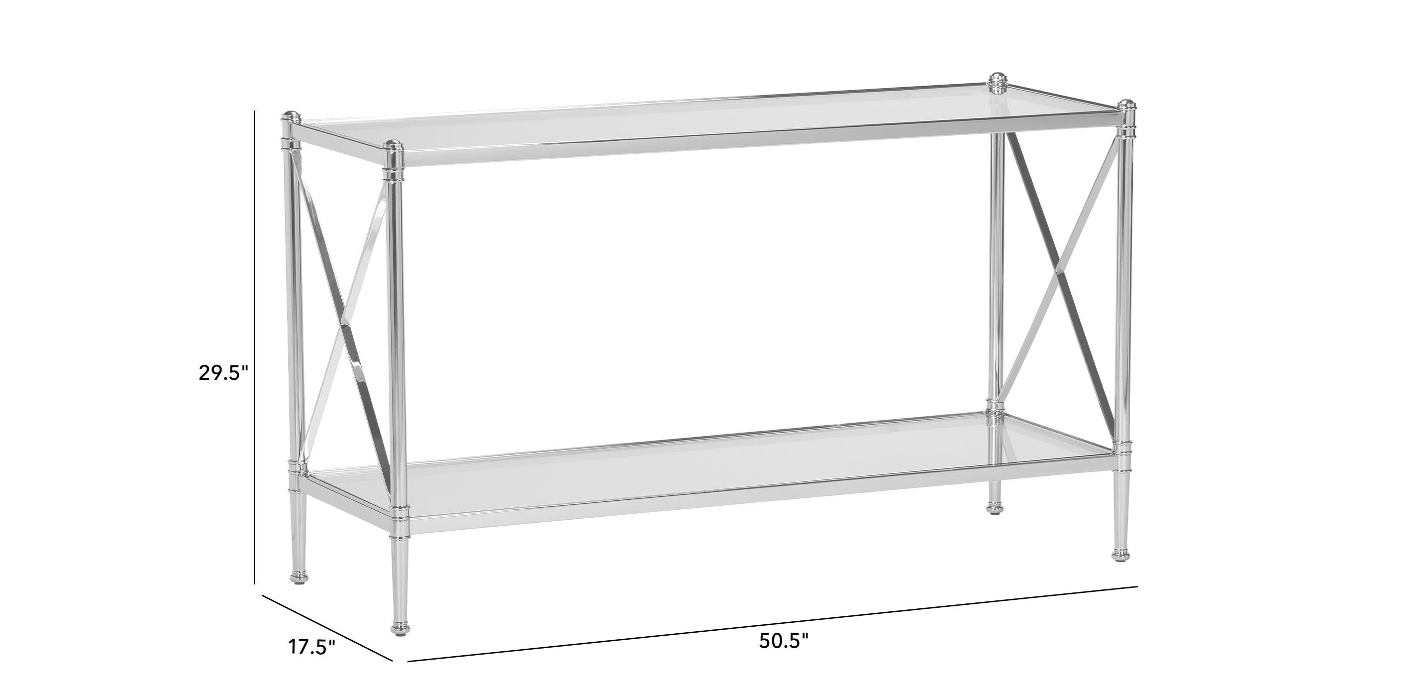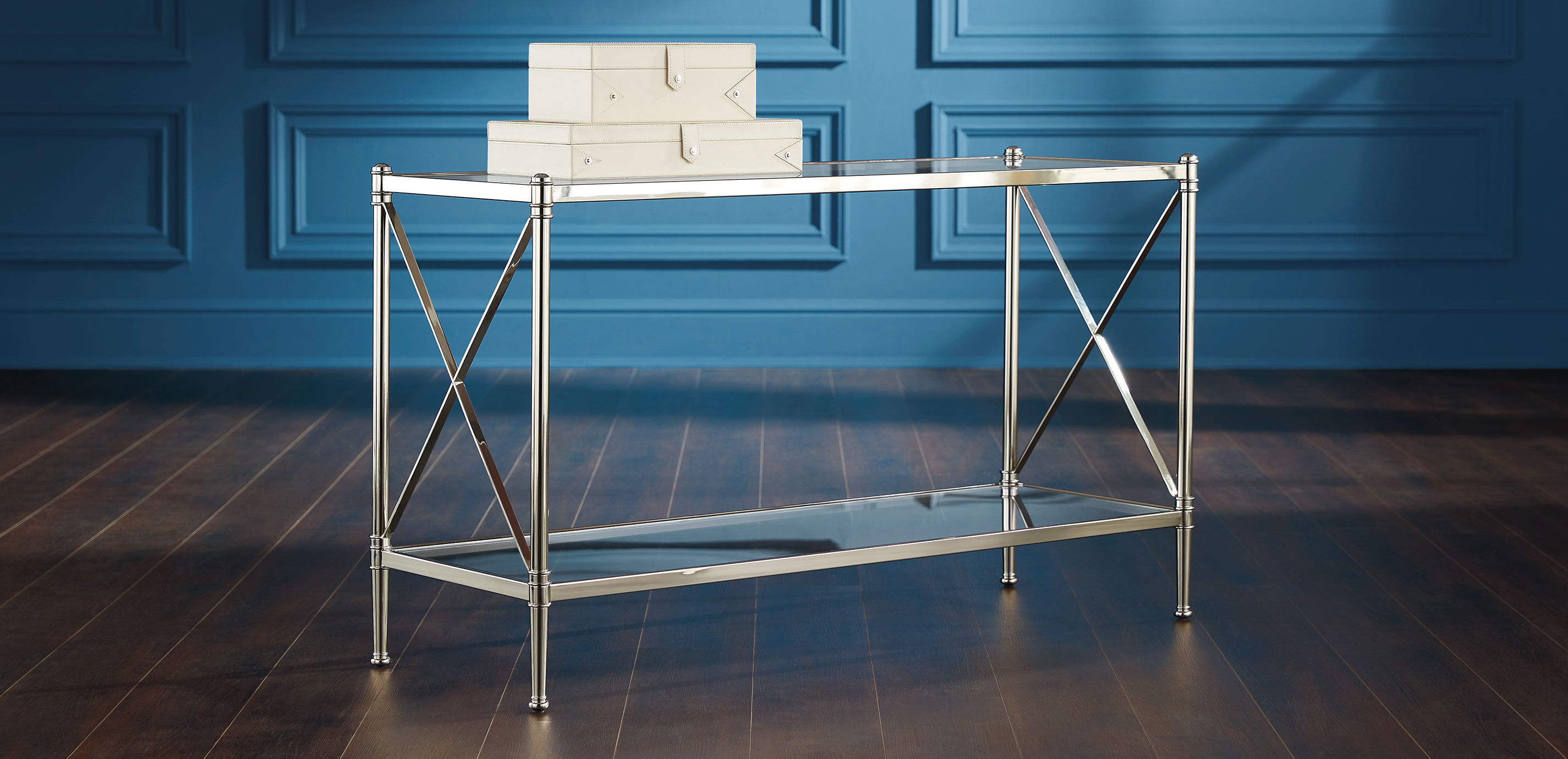 A starlet for your entryway, our Jocelyn console has a glamorous Old Hollywood sensibility. Its X motif has an industrial vibe; its glass top and shelf keep the look nice and airy. Choose a nickel or bronze finish. Metal and glass console table with clear Old Hollywood inspiration; features a dazzling X motif Frame crafted from steel. Shelf and top crafted from tempered glass. Choose from two finishes: Cufflink (115) or Smoky Bronze (145).