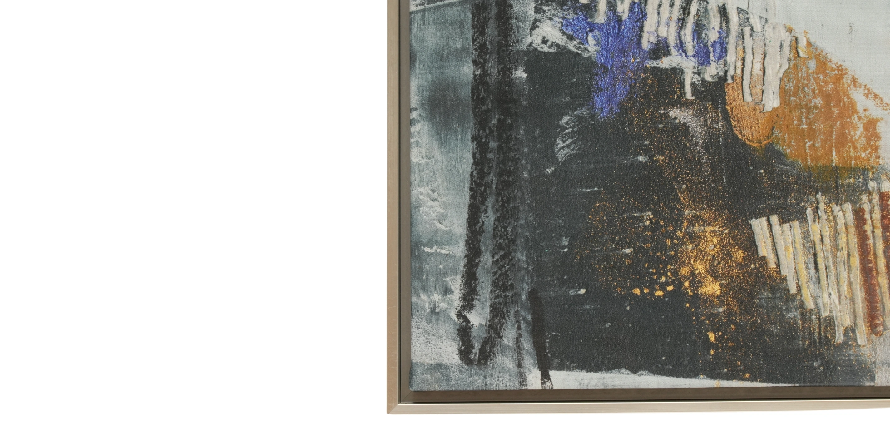Named for the essential unit that measures energy, this gorgeous abstract manages to be both serene and full of action. A soothing blue and white background brings tranquility; bold pops of color and metallic accents add a burst of motion and activity. One of a series.