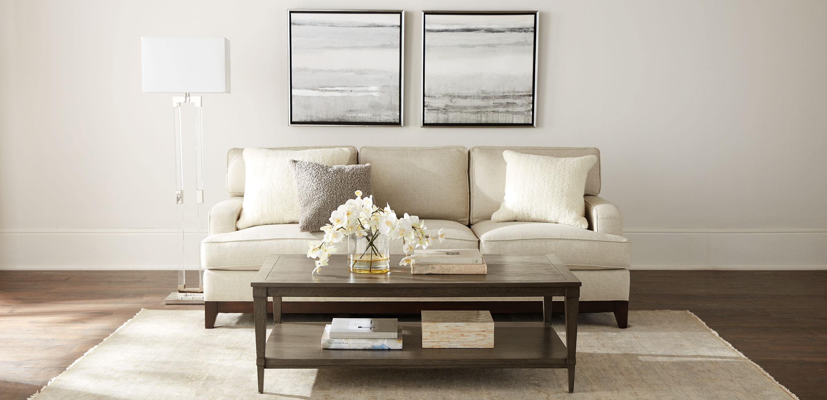 This sculptural floor lamp is a modern interpretation of the 1960s campaign-style lamp. Its structured, clear acrylic frame is accented with polished nickel cuffs for surprising texture and detail. Finished with a polished nickel square base and crisp white rectangular shade, it delivers a striking yet spacious style that stands beautifully in the bedroom or in the living room flanking a sofa.