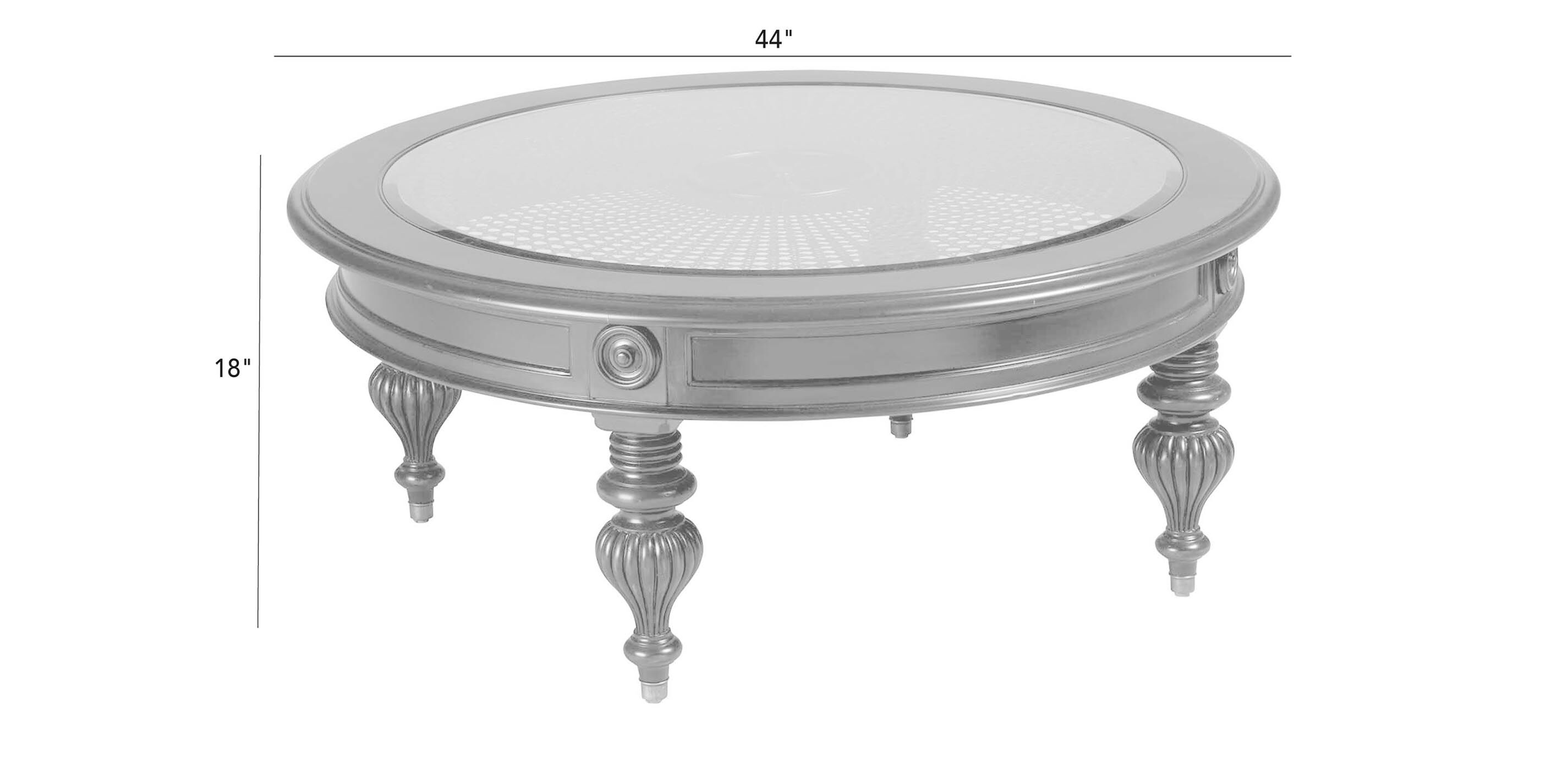 Such a practical and unusual shape! This round table it conveys a relaxed island feeling and encourages conversation. The table’s hand-woven cane top has a solid wood carved center rosette. The tabletop sits on four bold hand-carved legs with petite ferrules. The workmanship: impeccable. Crafted from mahogany wood solids with mahogany wood veneer lamination; weaving rattan splits* Inset beveled tempered glass top Hand-woven cane top with hand-carved solid wood rosette Beaded apron with turned rosettes above each leg Hand-carved legs with ferrules and reeded baluster