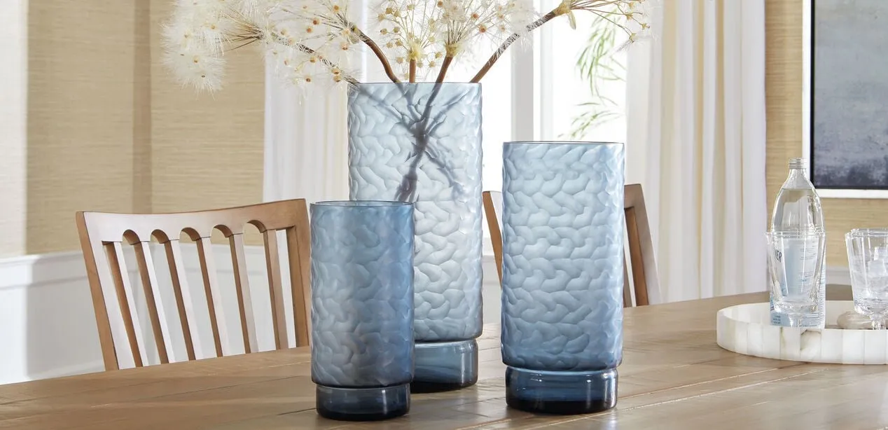 The ombre-like appearance of the Chelsea dark blue glass vase is only part of its appeal—albeit a large part. What makes all three vases (it’s available in large, medium, and small) truly stand out is the artisanal craftsmanship that goes into them. The textured, recycled glass vases are made from mouth-blown, colored glass in India. The glass is hand-cut over several stages once it’s cooled, so each vase varies slightly in size, color, and finish. They’re intentionally left unpolished, resulting in a gorgeous light matte finish.