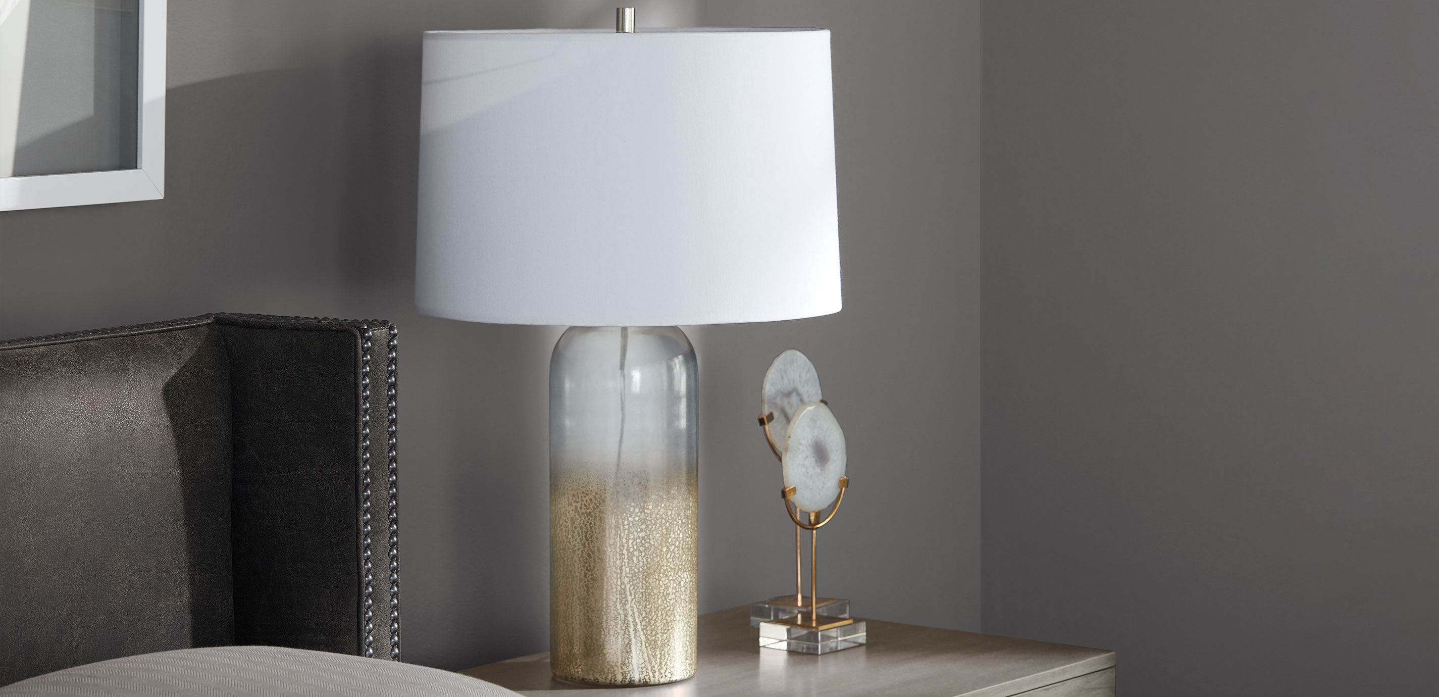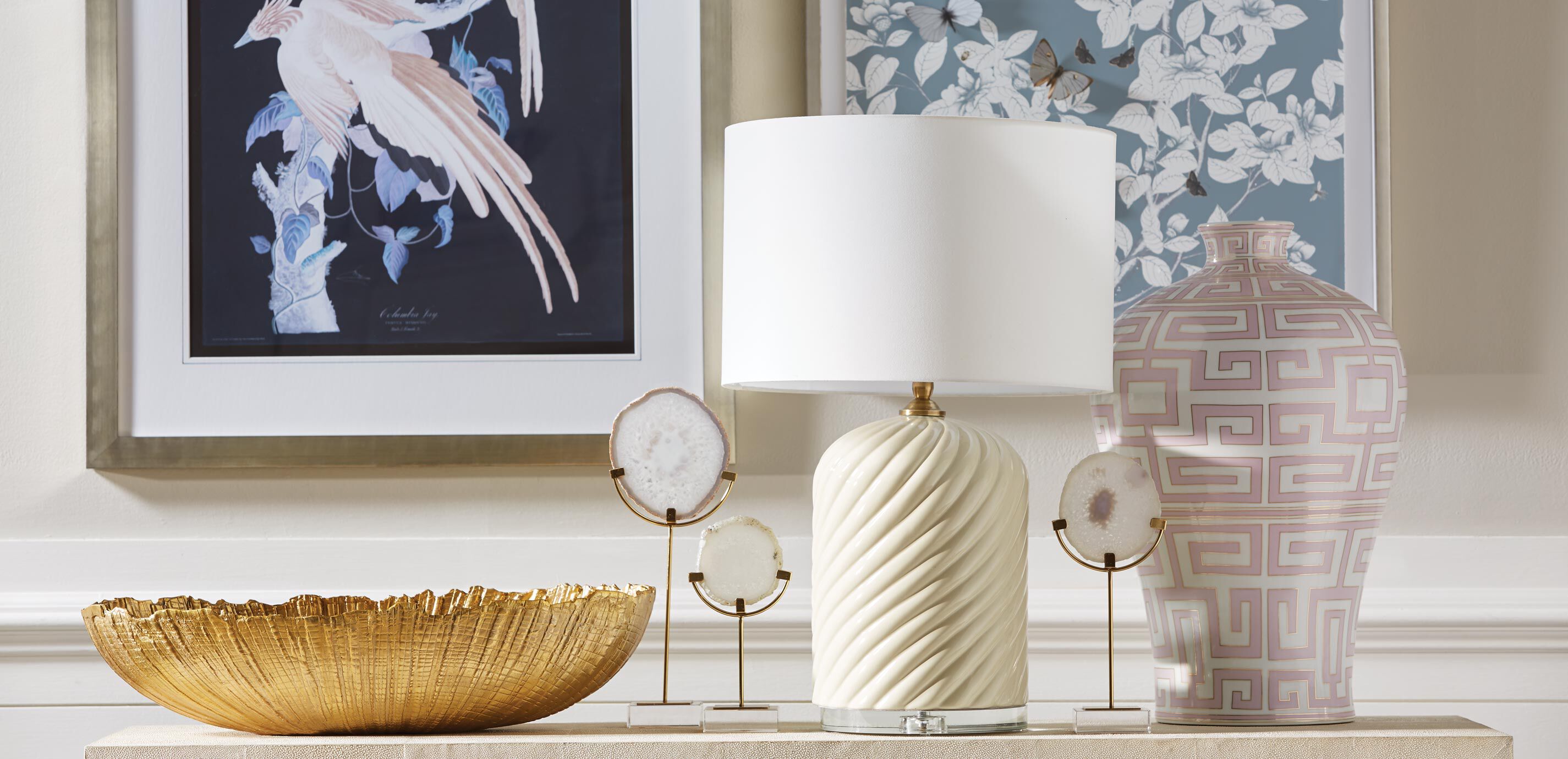 When you're looking for a one-of-a-kind decorative accent, look to nature for inspiration. That's how we were inspired to create our agate decor: Our artisans handpick beautiful slices of agate, each one with its own unique markings, mounting the sliced agate on a stand made of untreated, lead-free crystal. Made of iron, agate and crystal base Shiny gold finish on stand and natural agate Agate stone color will vary