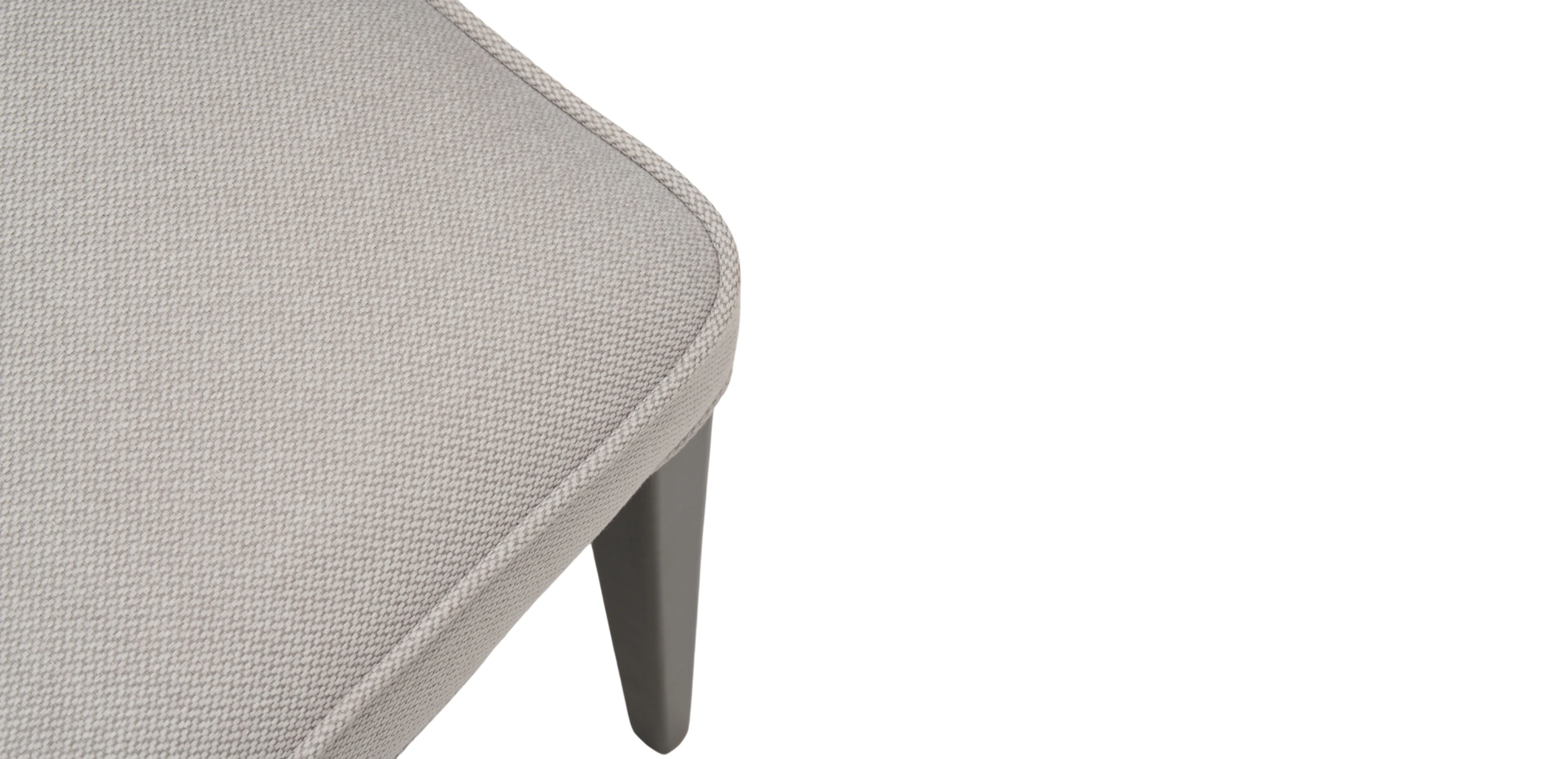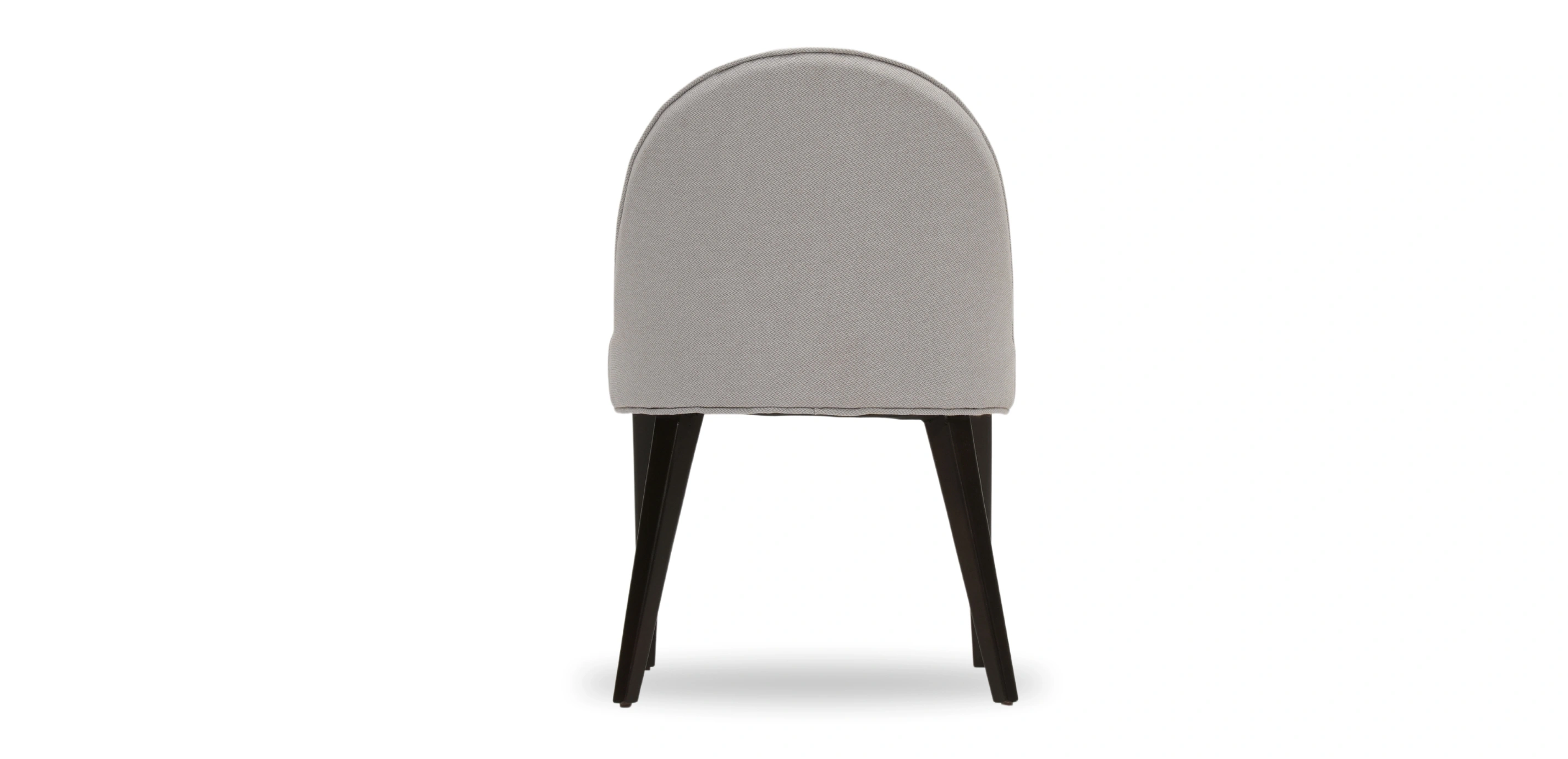 A mid-century modern fully upholstered dining chair featuring a tight back and tight seat