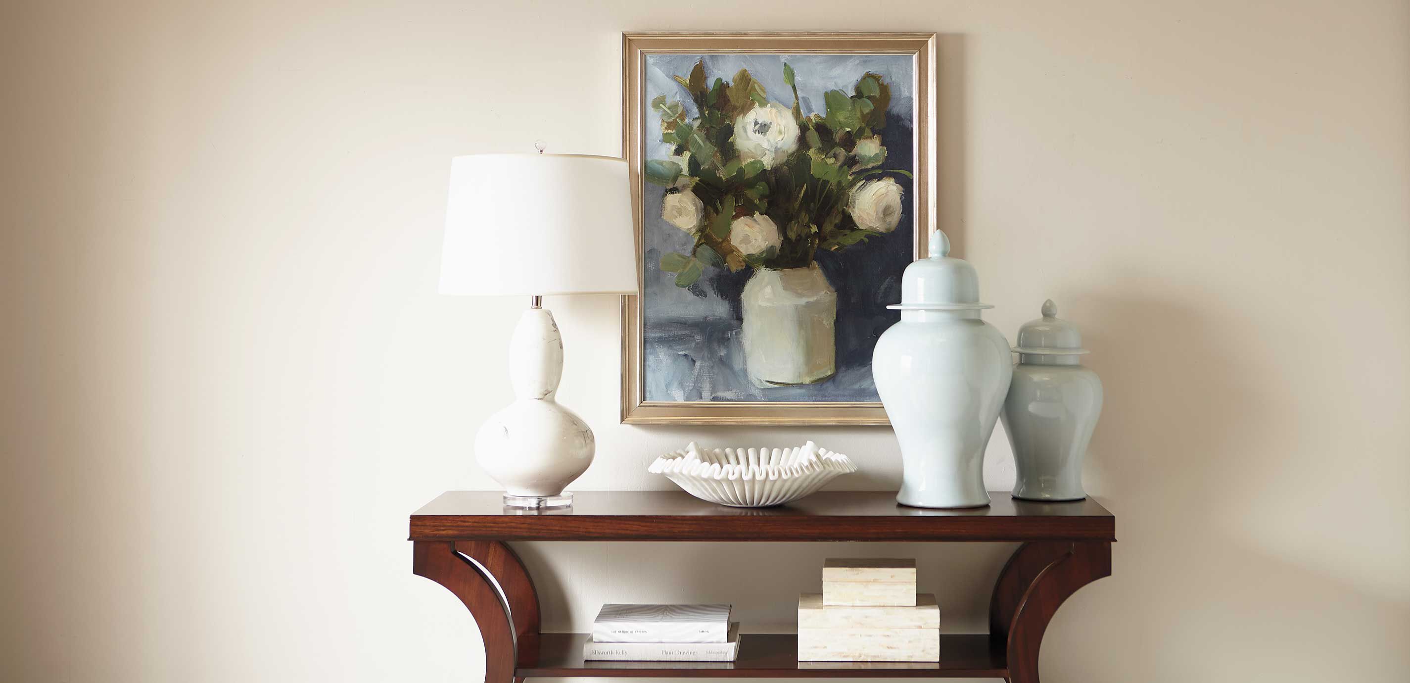 Made in the U.S. by Ethan Allen artisans Product weight: 11 lbs. Packaged weight: 16 lbs. Artist - Leslie Dyas: With a philosophy of lifelong learning, Leslie Dyas has evolved and grown as an artist over the years. From her degree in graphic design, she has pulled a strong sense of composition and dedication to good design in all facets of her art. A somewhat classical aesthetic infuses all her work, even as she strives to bring a sense of freshness and expressiveness to each new painting. Her graphic design background has given her an ethic of perfection in terms of craft. Fine oil paints and natural mediums on linen canvas are the artist's primary instruments.